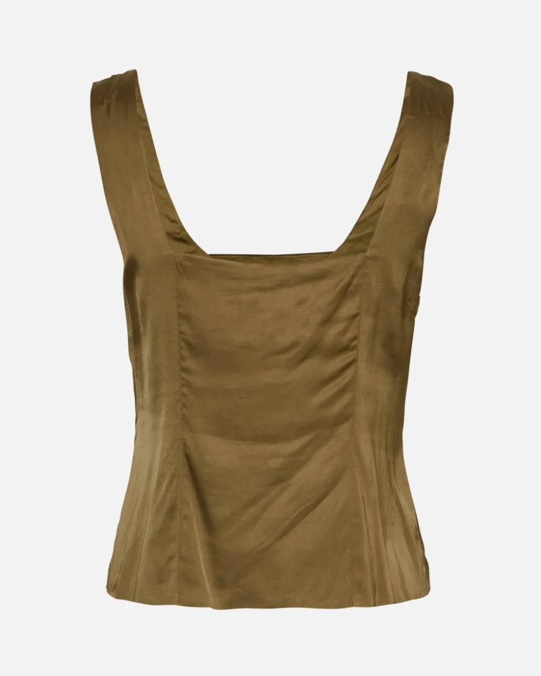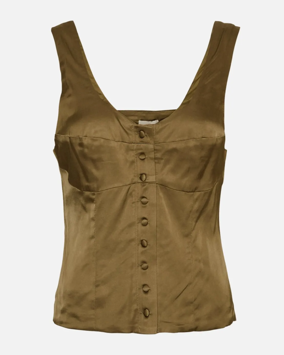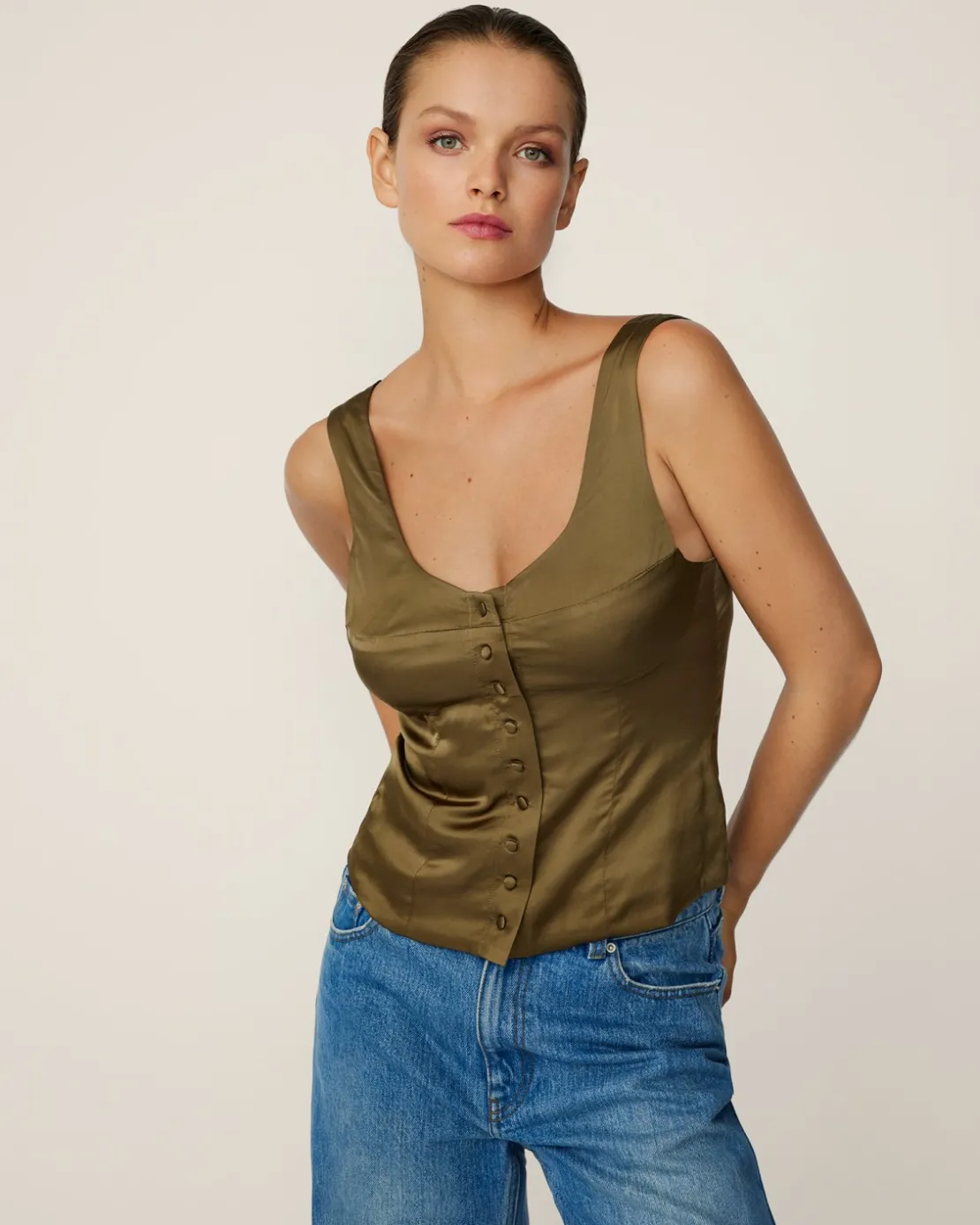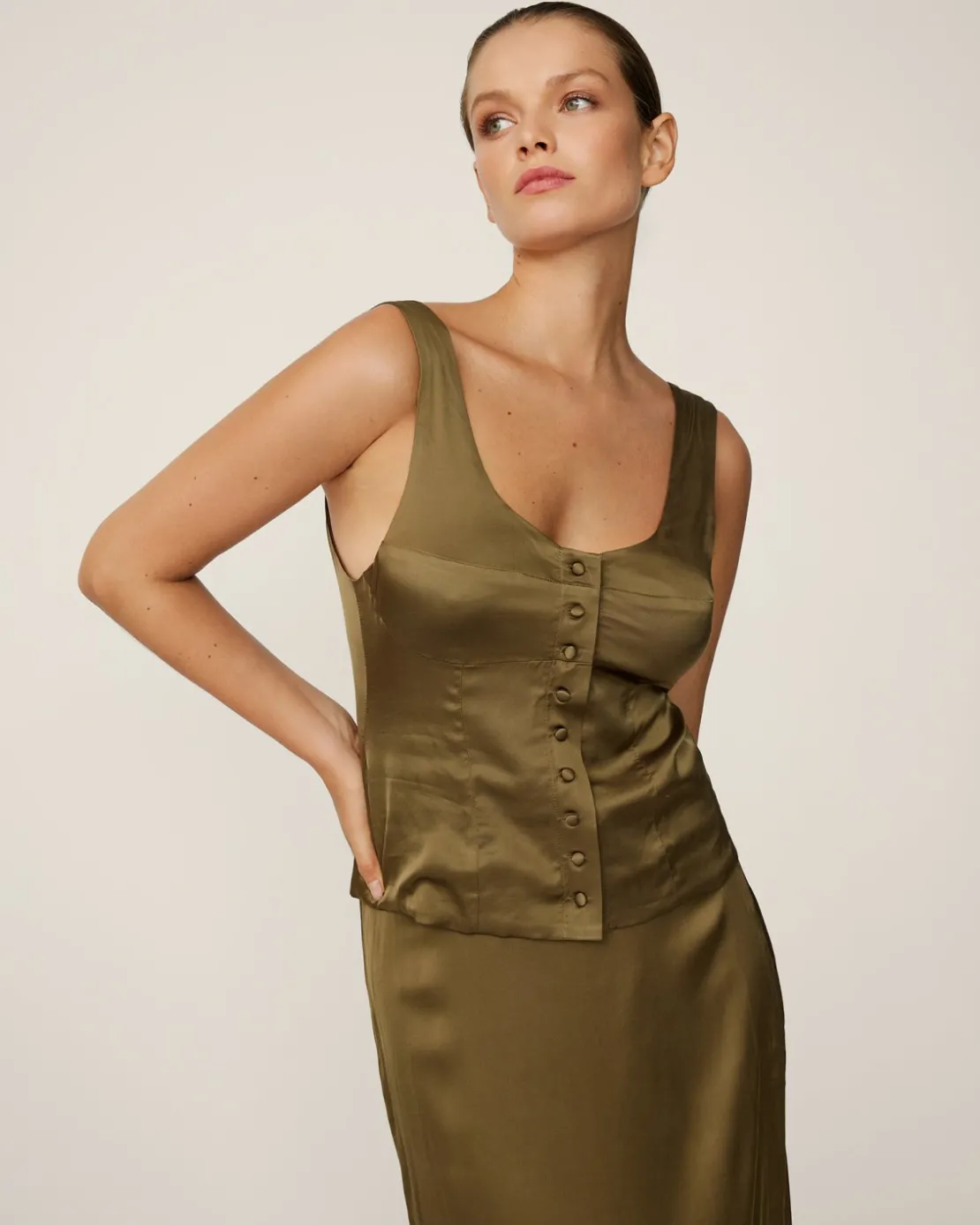 A fusion of chic elegance and Scandinavian minimalism. Julietta strap top features a tailored fit that flatters your figure with effortless sophistication. The curvilinear design of this top adds a touch of modern flair to this silhouette, while the fabric-covered button element completes this piece as a refined and sleek look. Whether wearing it for special occasions with the matching Julietta long skirt, or dressing it down with jeans for a casual ensemble, our fitted top is the go-to choice for those who appreciate timeless style for many years to come.