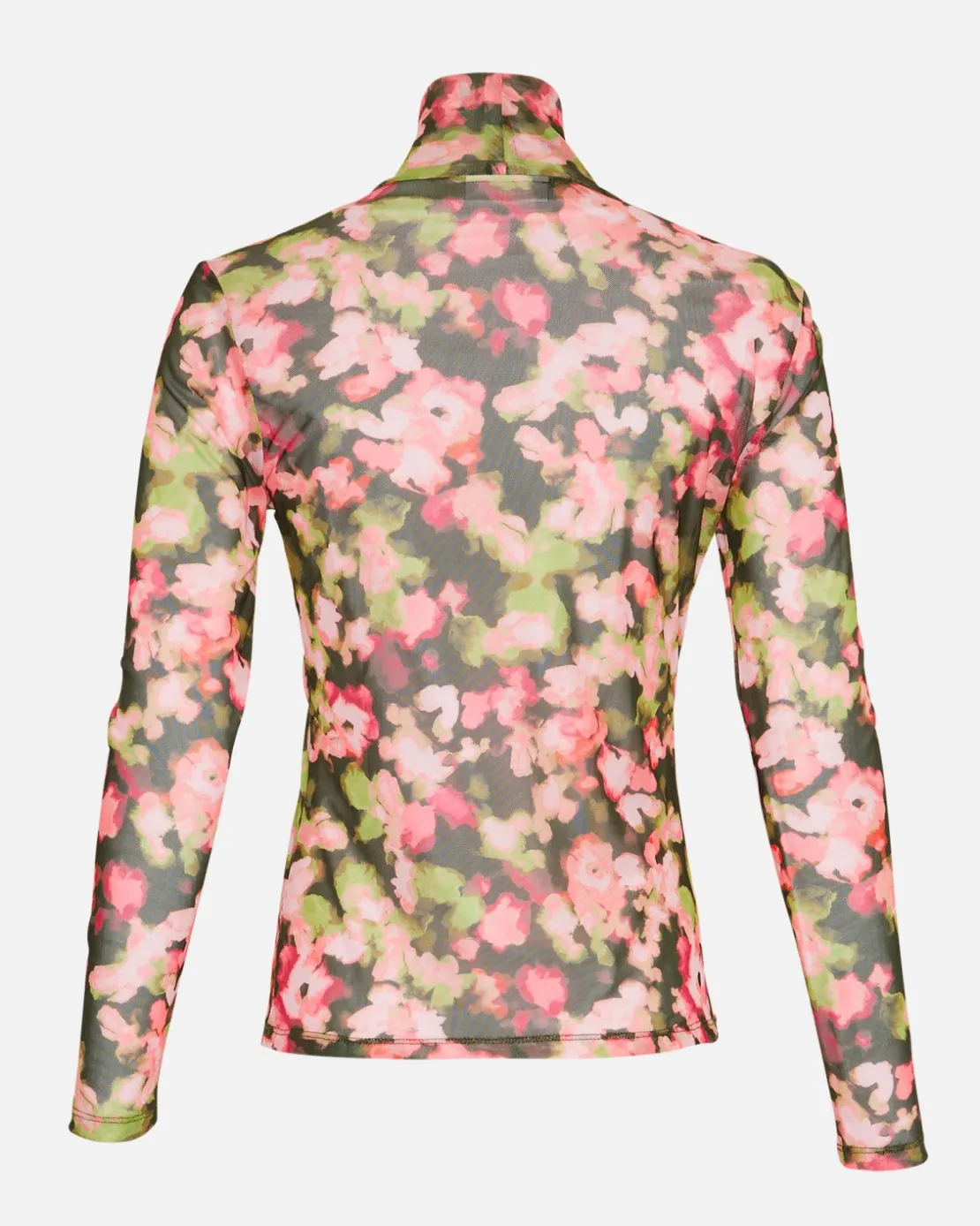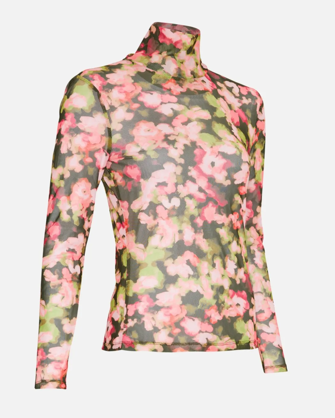 This top has an all over floral print, in a mesh quality. It features a high neck and long sleeves.