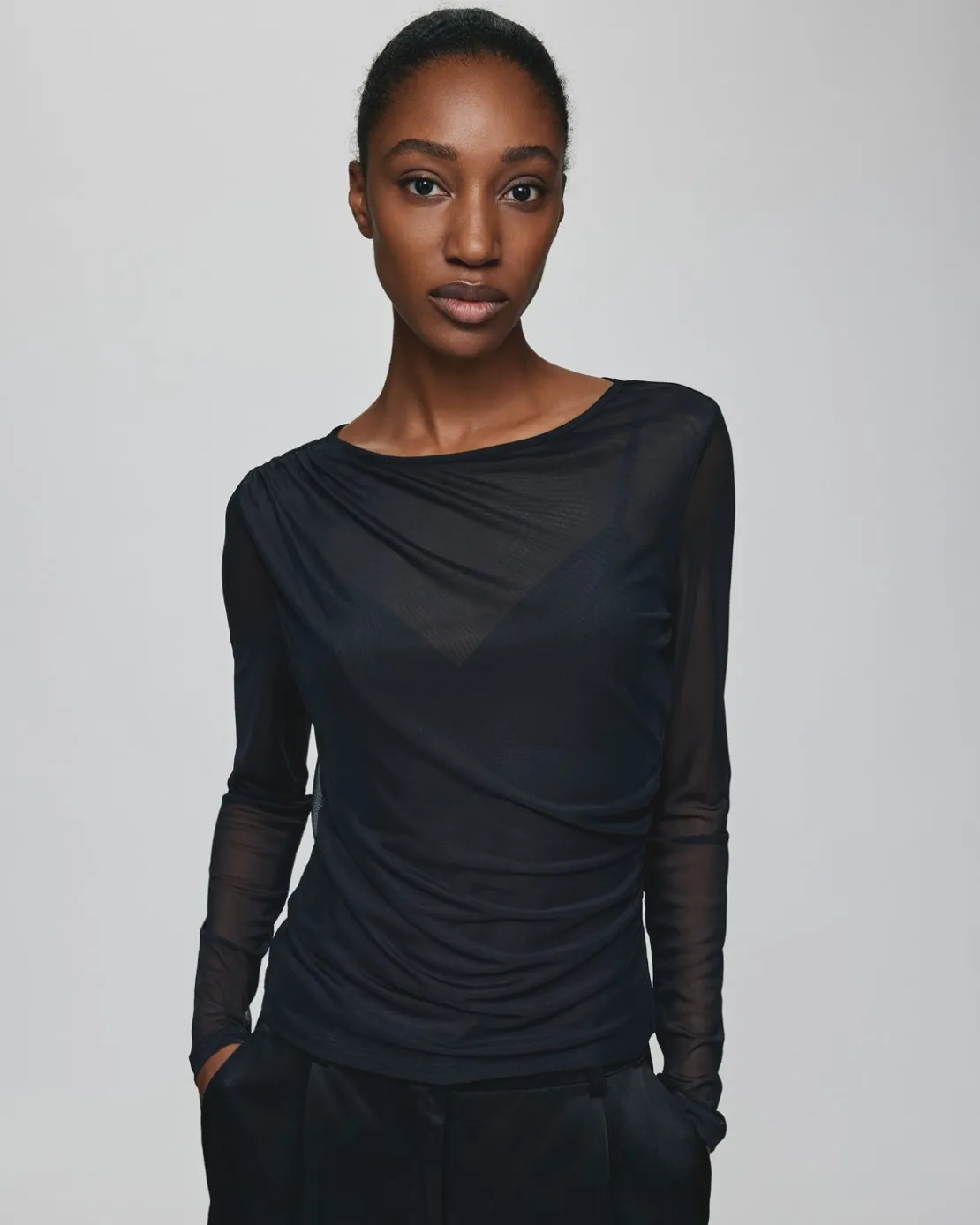 This top has a slim fit. The model is 173cm and wears a size S.