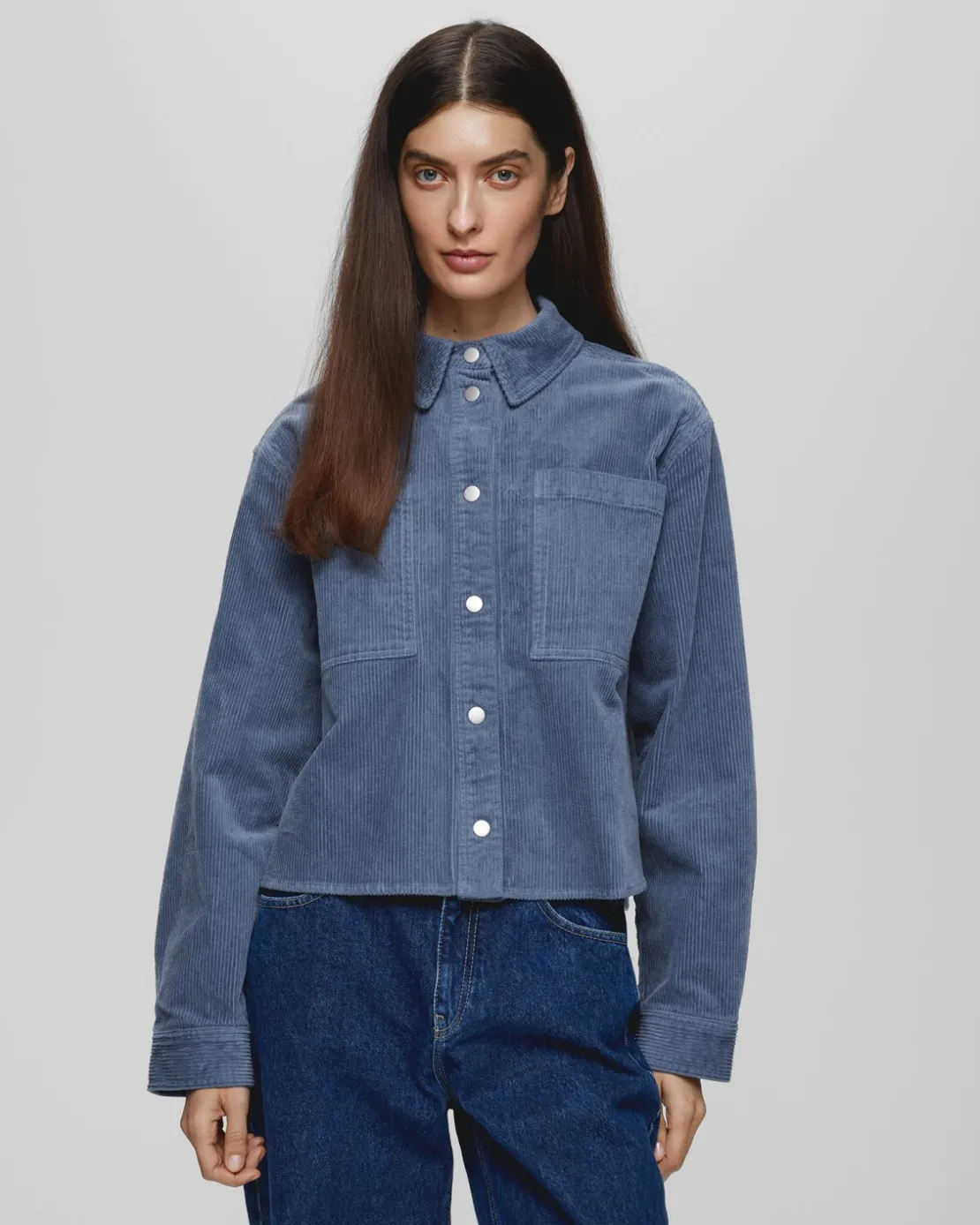 A minimalistic corduroy overshirt that blends fashion with comfort. It is designed with a corduroy fabric, offering a cozy and soft texture, perfect for the colder seasons as a layering piece. This silhouette features a double front pocket, adding a touch of utility while maintaining a sleek and chic look. The button closure adds a functional detail, allowing you to wear it open or closed, depending on your style.