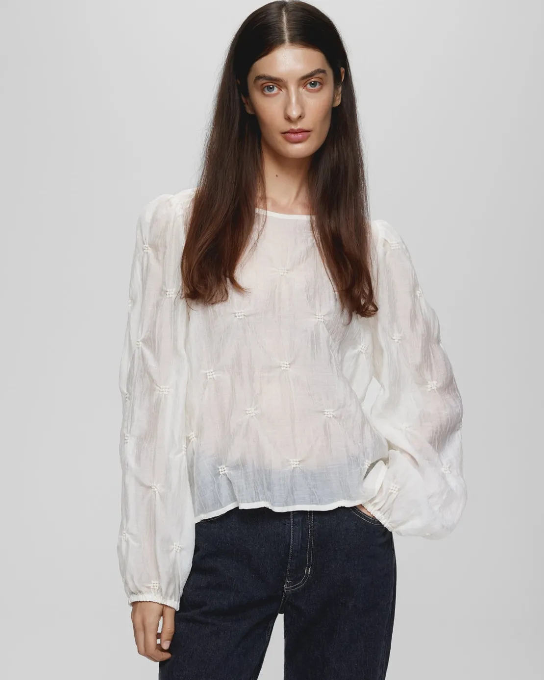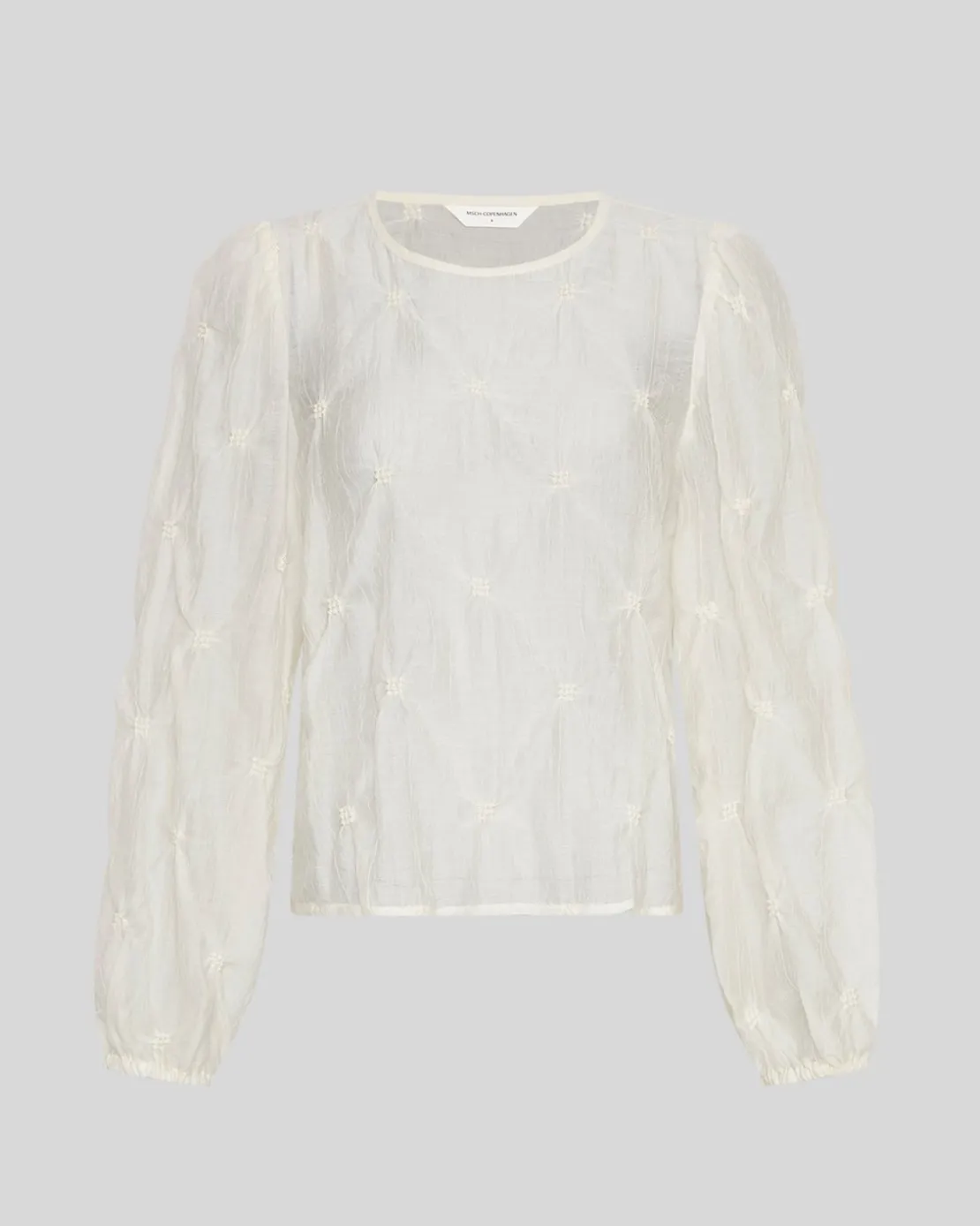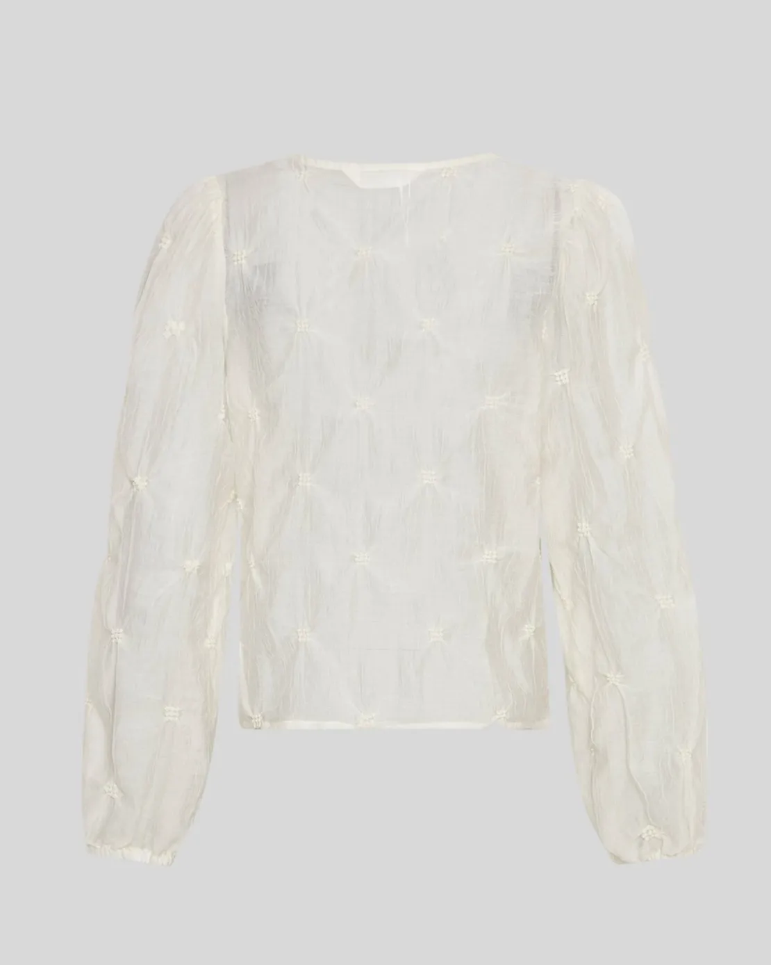 Our Caroline top is a feminine top in an almost seethrough material and added is small, almost flower looking gatherings all around to create a pattern but also this elegant touch. The Top has a round neck, with long sleeves and slim elastic cuffs.