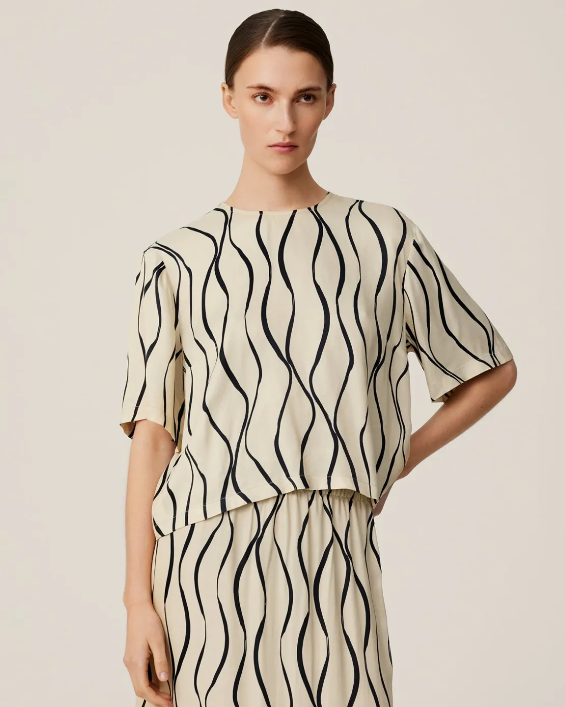 Rikkeloa is a new matching set, consisting of a long skirt and this top, made in a soft, comfortable material. It features a round neckline, loose sleeves in a 2/4 length and button-up detail on the back. It’s the ideal combination of stylish, contemporary and comfortable. You can dress it up with a pair of trendy high-waist jeans or tone it down with a pair of cargo pants.