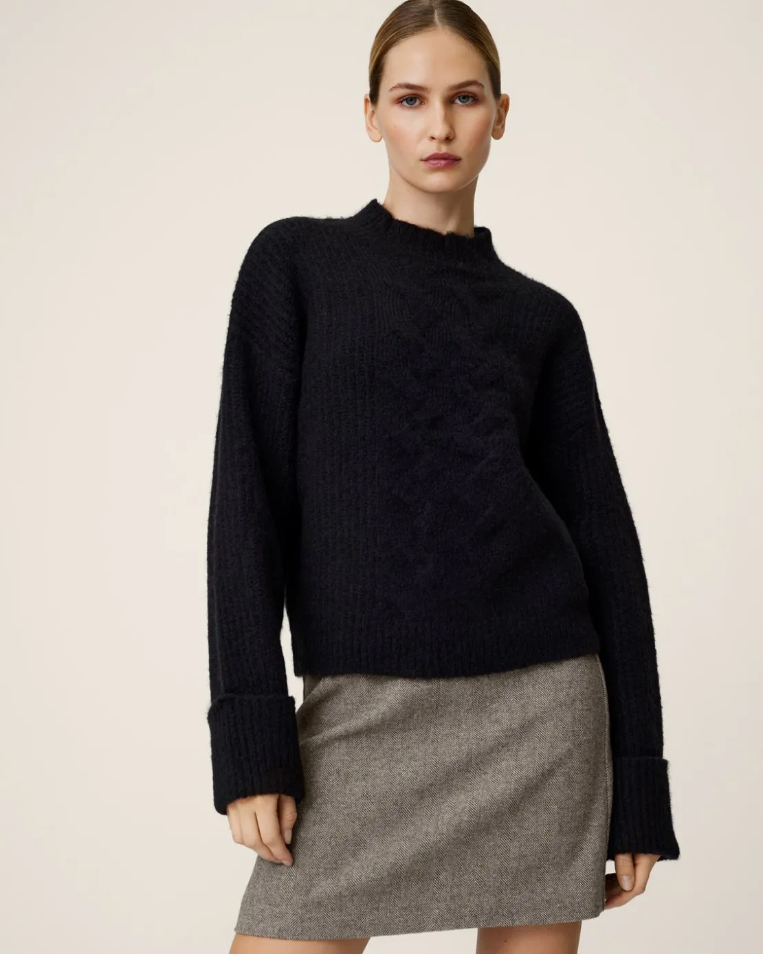 This knit has a regular fit. The model is 178cm and wears a size S.
