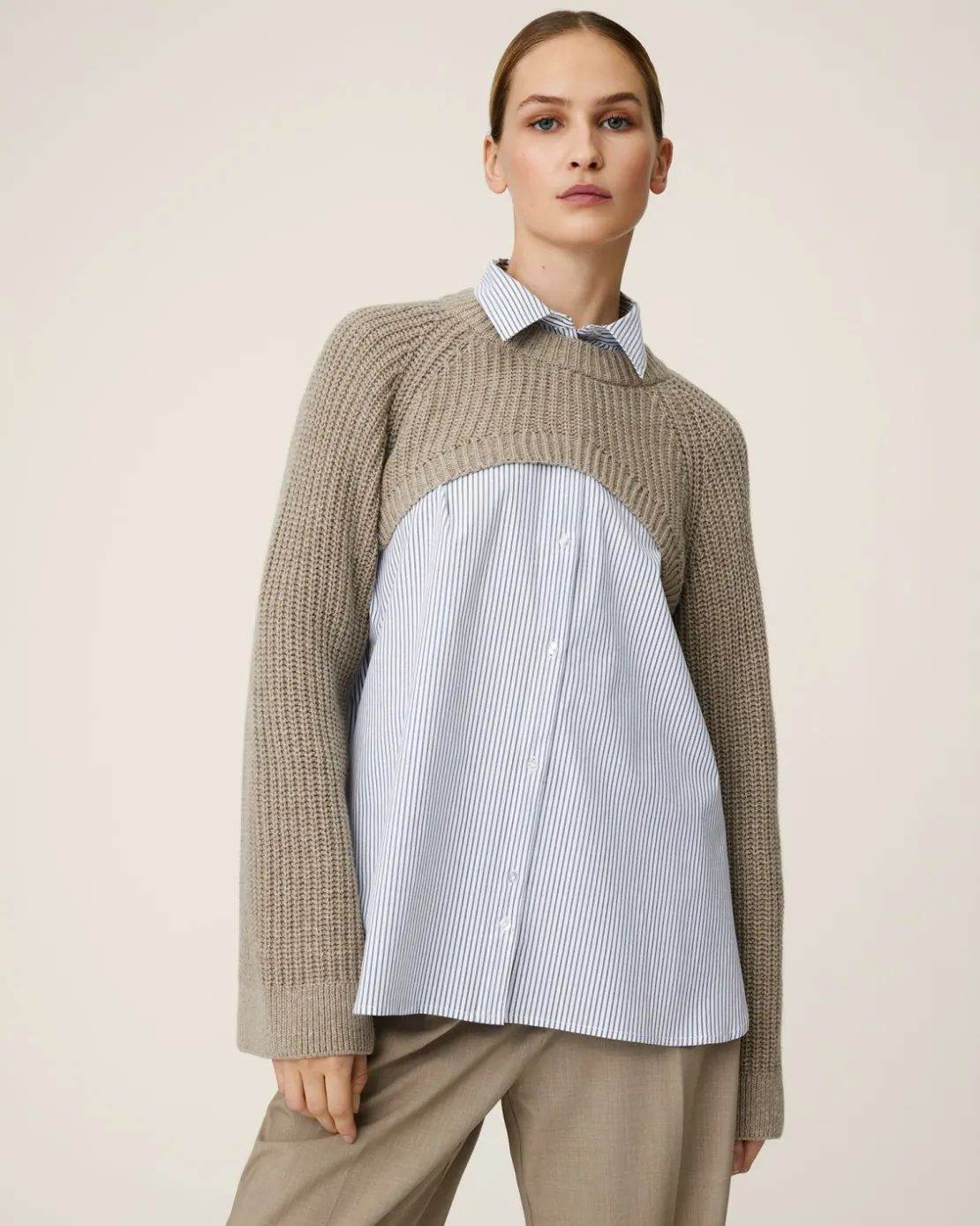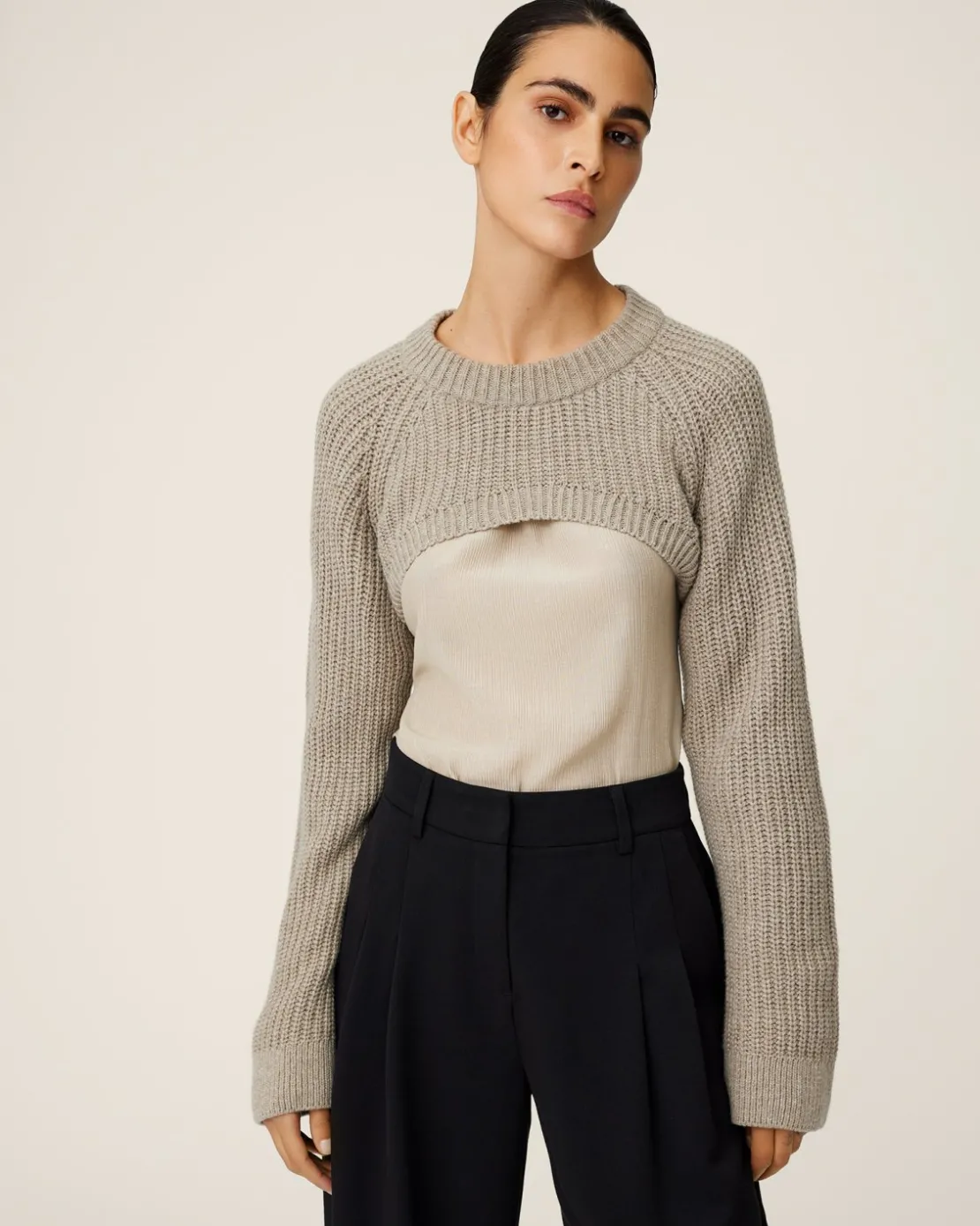 Our Faye short pullover is similar to a bolero. It’s cut off above the chest, so it only has collarbone and arm coverage. It keeps you warm, yet is a stylish and fashion forward choice of outfit. It’s good for layering, for staying warm in the inbetween seasons, and it gives you the opportunity to show off the shirt you’d normally be wearing underneath a regular pullover.