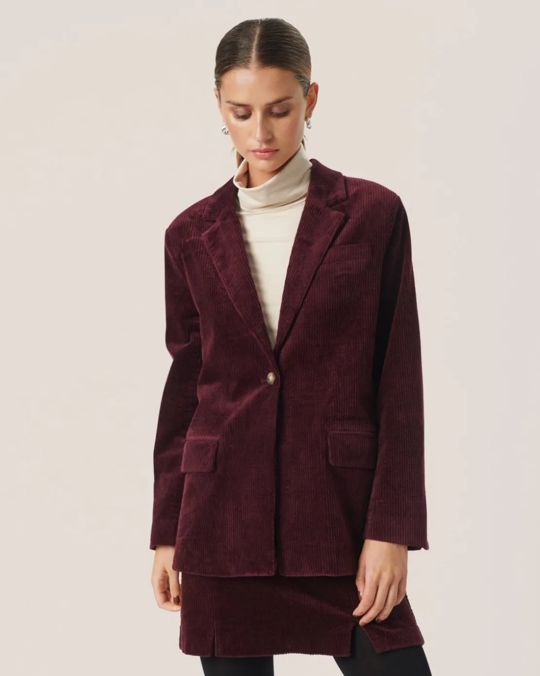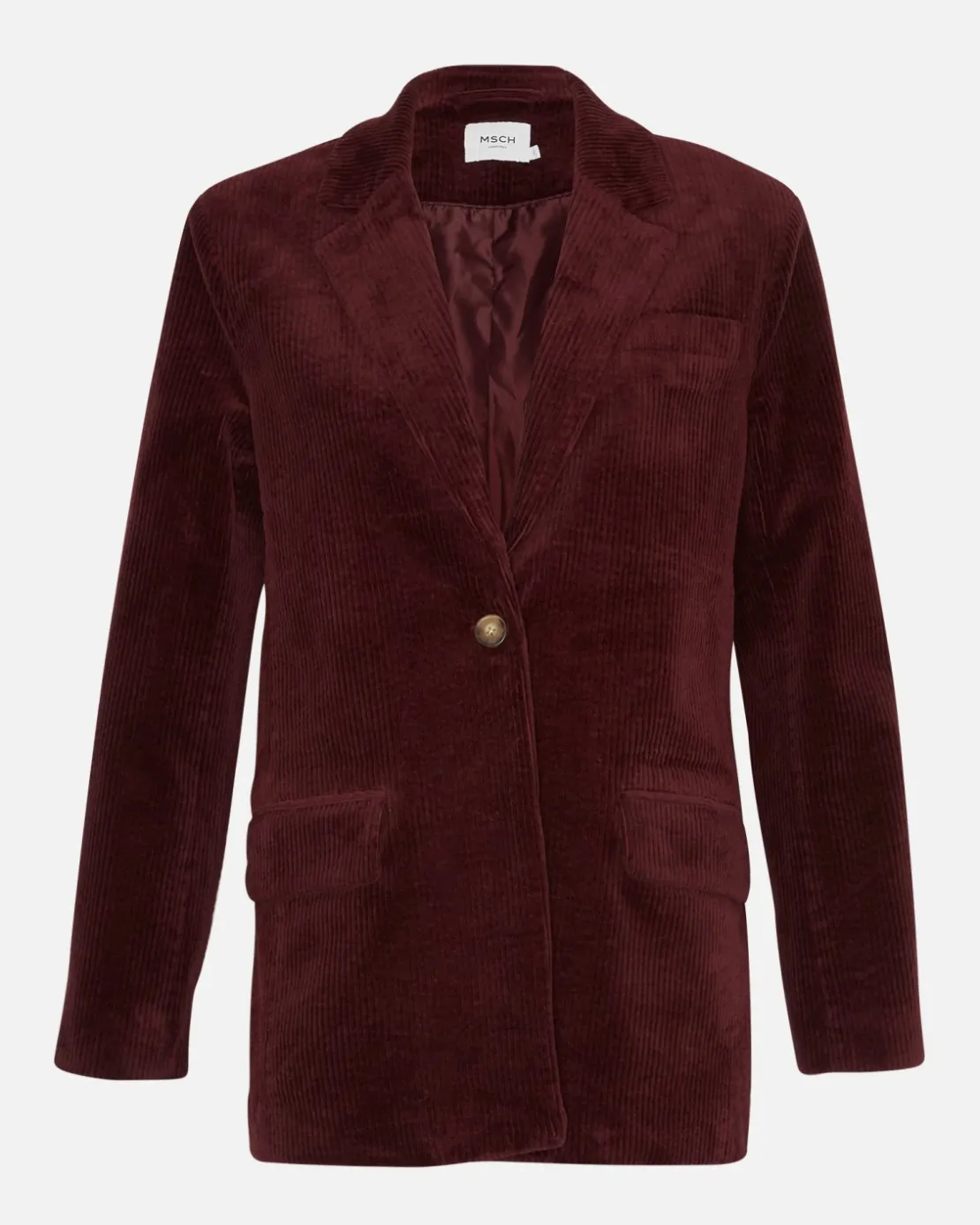 Cool retro blazer in a warm wine red colour. Single button closure and two side pockets.