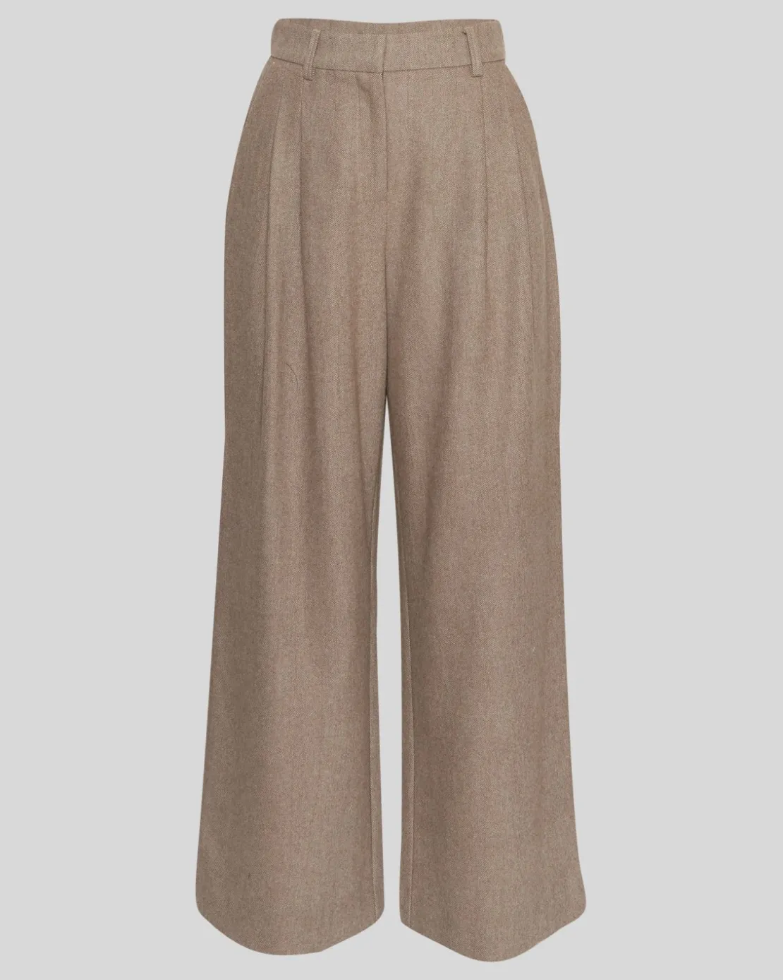 A pair of perfect suit pants for winter. These pants feature a warm brown colour and is made in a wool blend material to add extra warmt to your legs during these cold months. The design is a high waisted, wide legged pant with pleats, pockets and zipper/button closure.