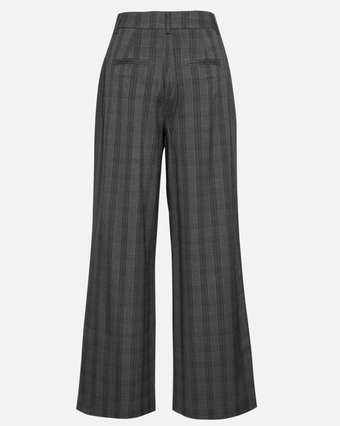 Calile is a high waisted, dark grey checkered suit pant with wide pant legs and pleats at the front. The pants feature side pockets and belt straps. they’re a statement piece. Style them with either the matching waistcoat or blazer.
