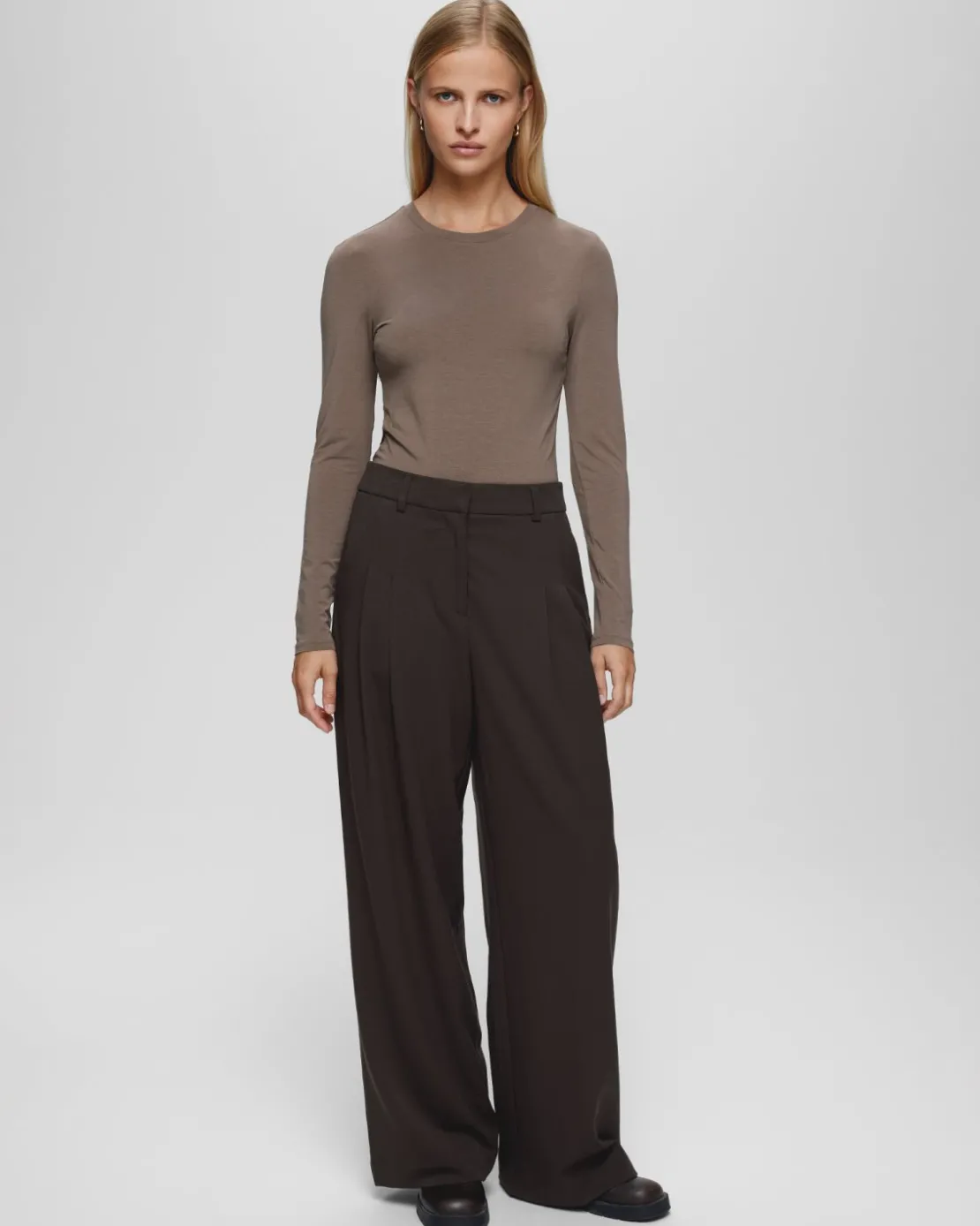 These pants have a wide-leg fit. The model is 176cm and wears a size S.
