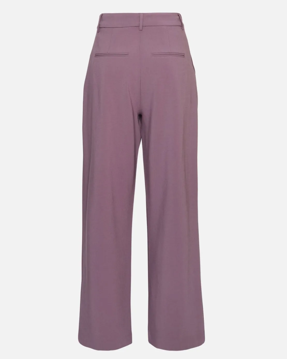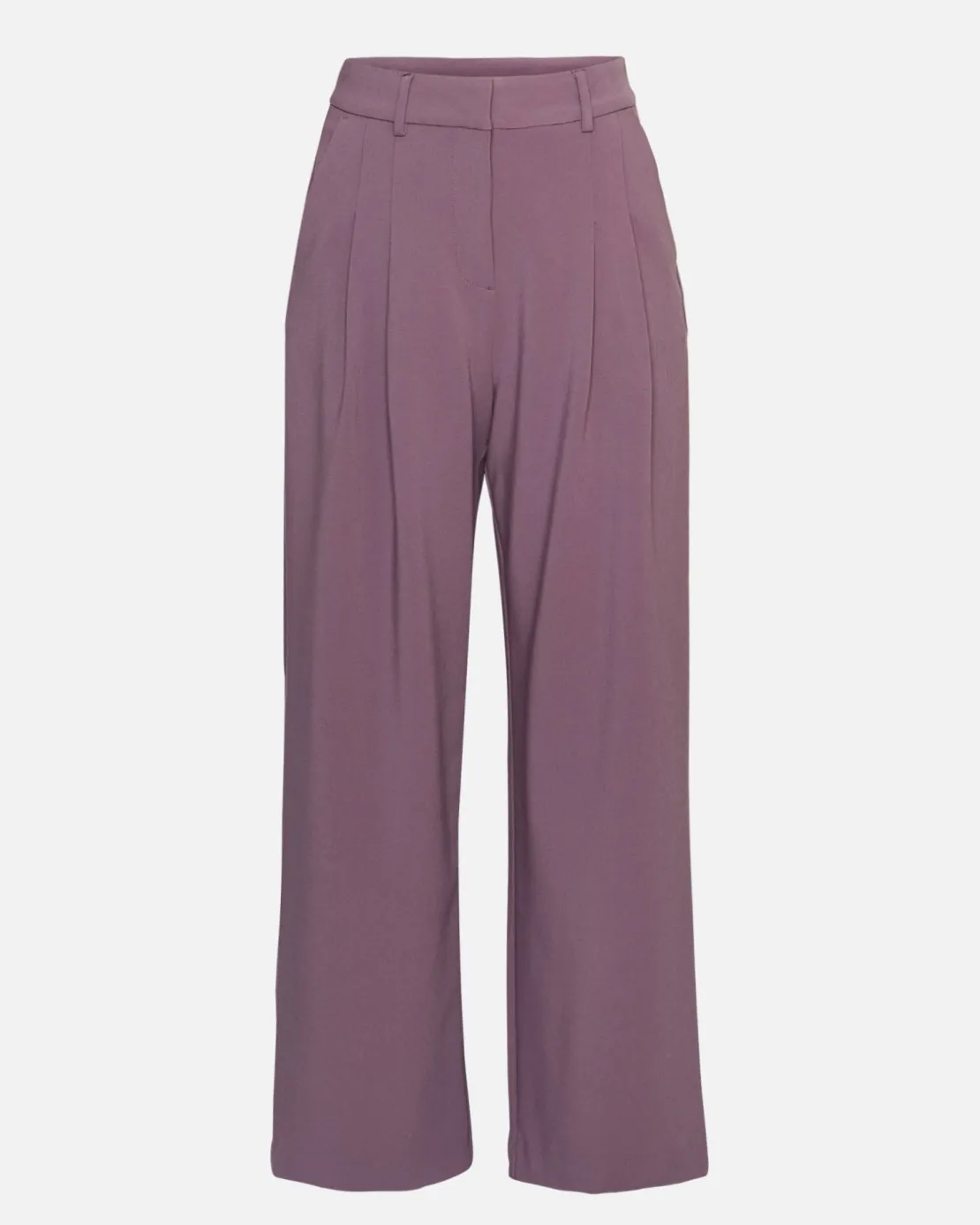 The Mirabelle suit pant, is a soft, high waisted pant with wide legs with pleats and side pockets. The colour is a warm, dusted purple perfect for autumn.