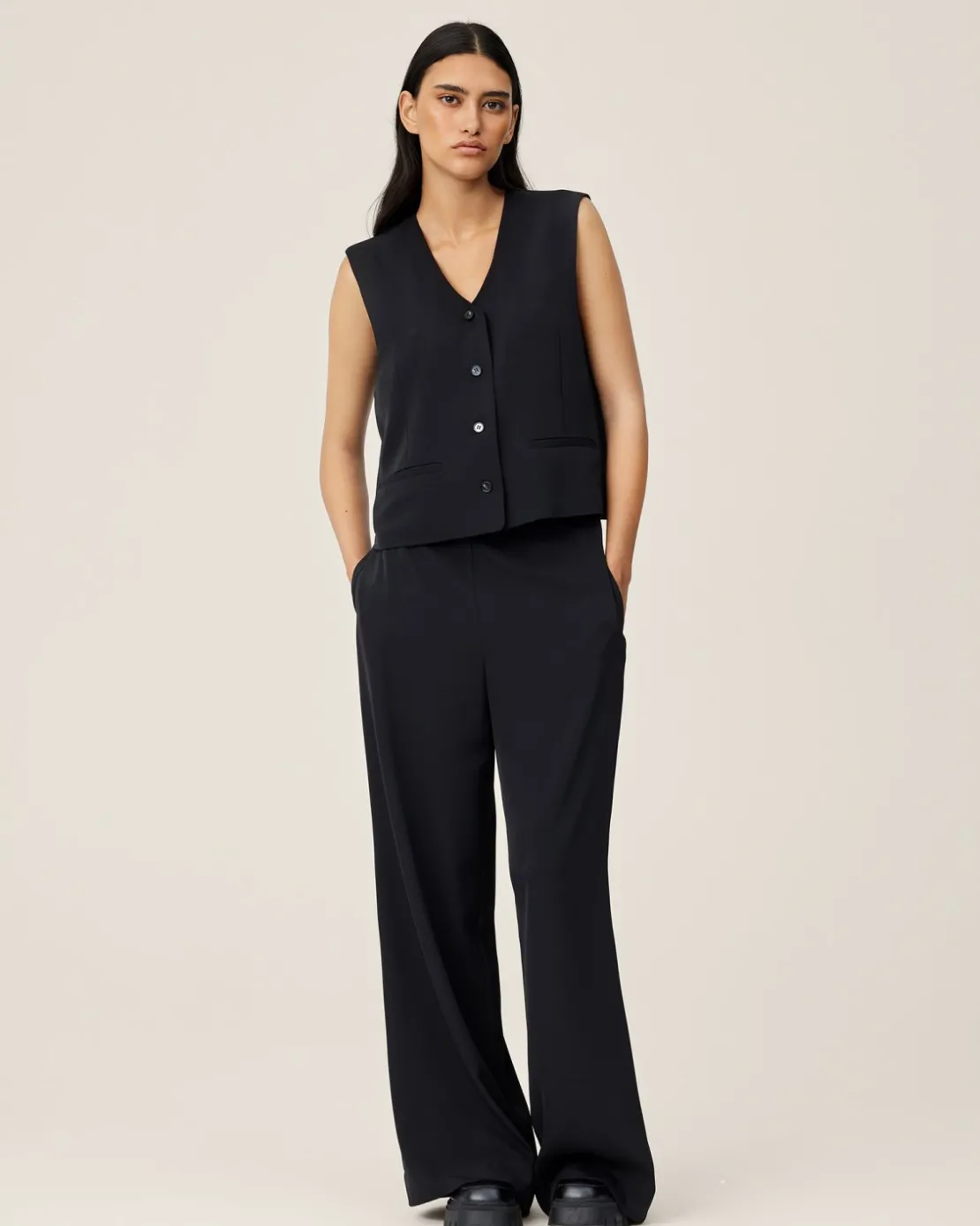 Nichelle is a classic, black suit set consisting of this waistcoat and a pair suit pants. The pants are high waisted and wide legged. It’s the perfect office wear.