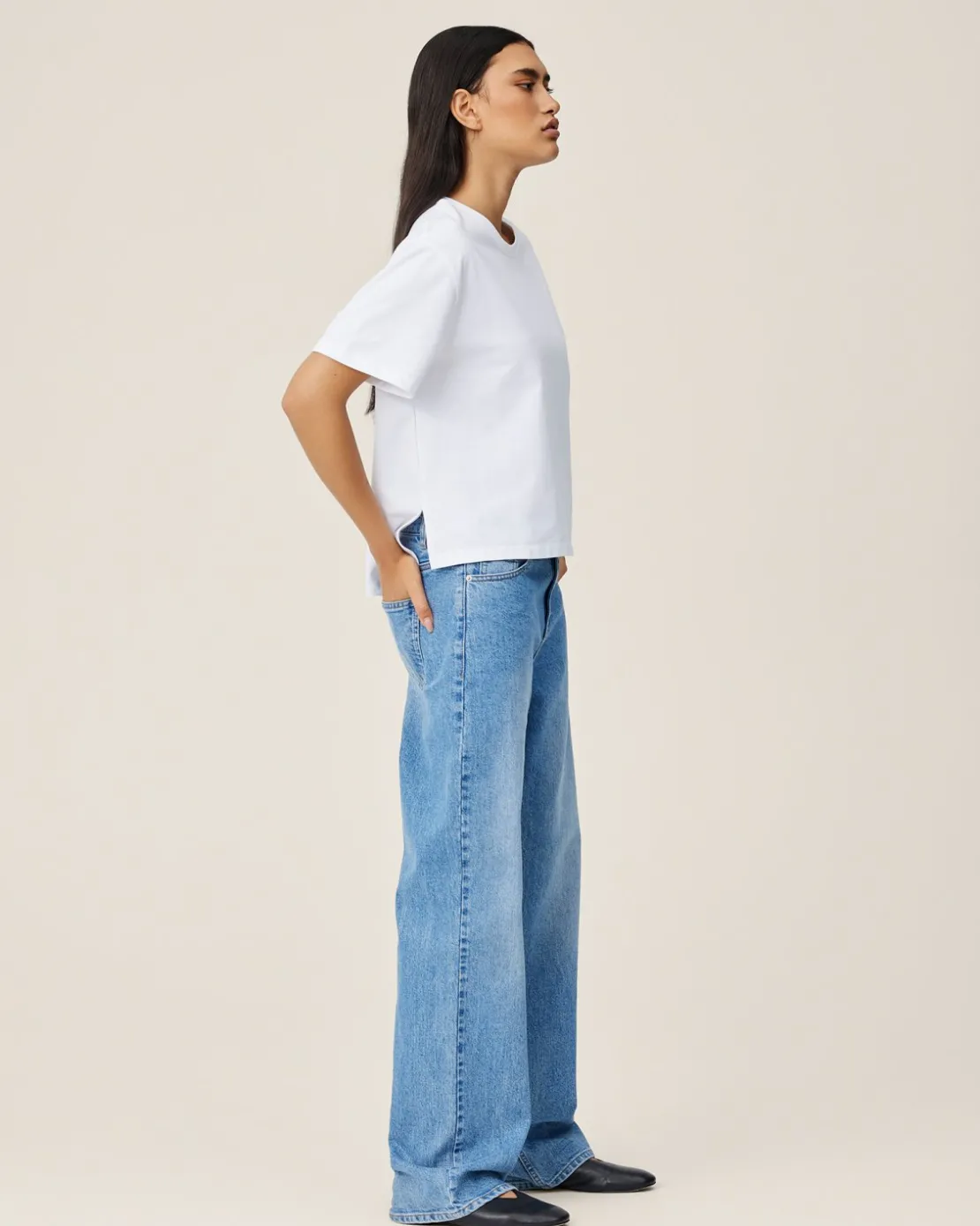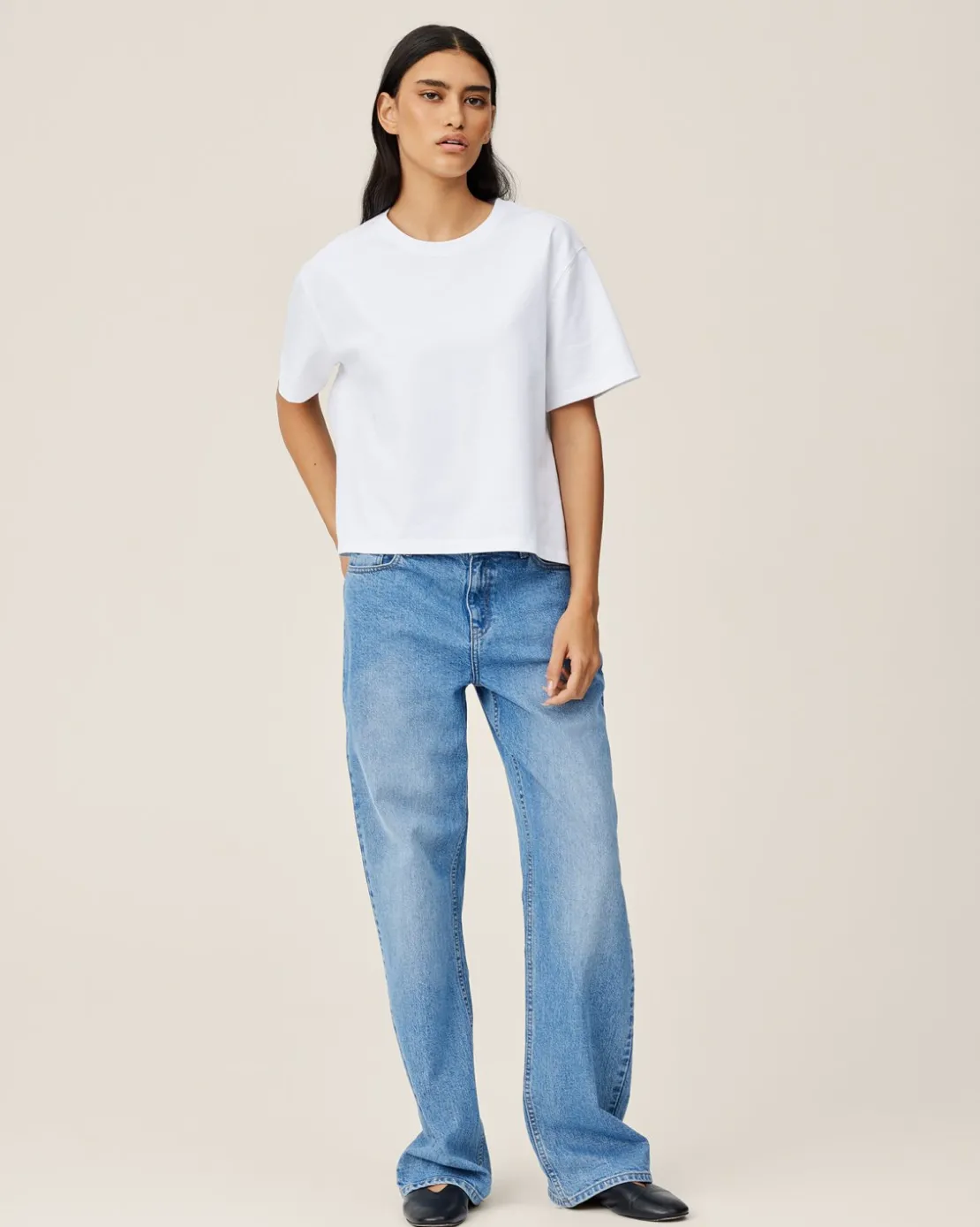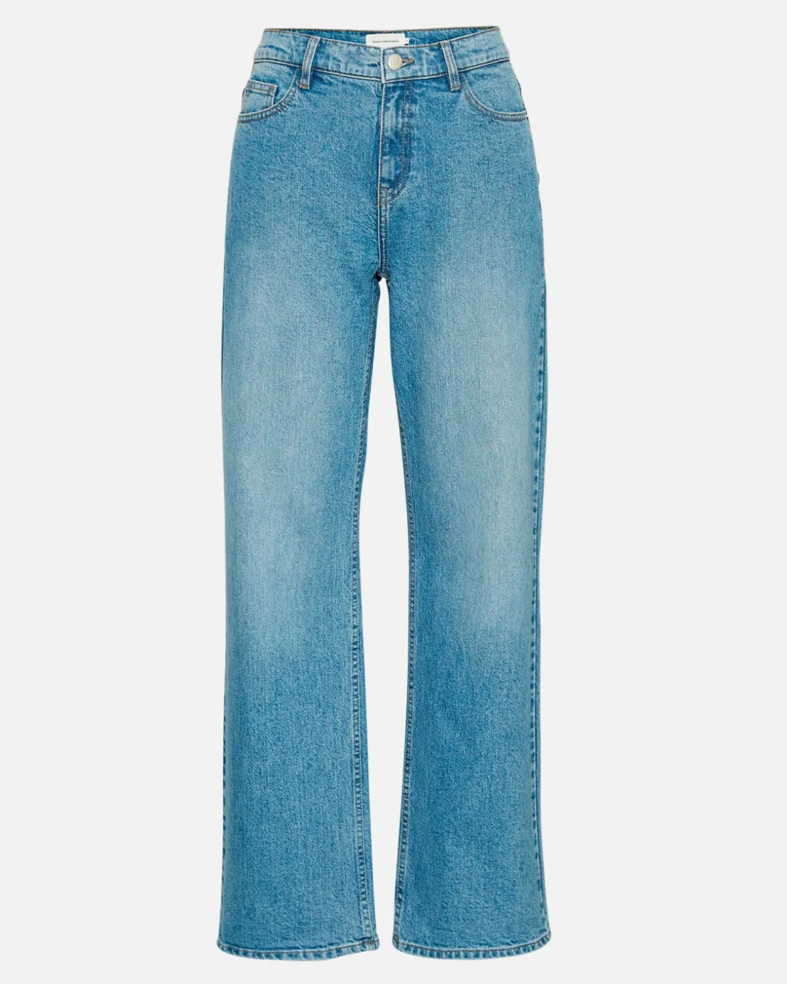 Our newest addition to our jeans collection is these relaxed, mid blue jeans, they have a straight fit and full length pant legs. They have a regular waist and features a zipper and button closing. The jeans have sevaral pockets both front and in the back. A staple piece in your wardrobe.