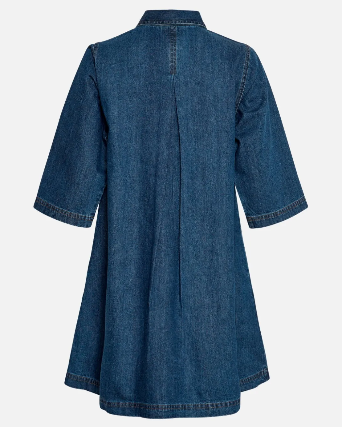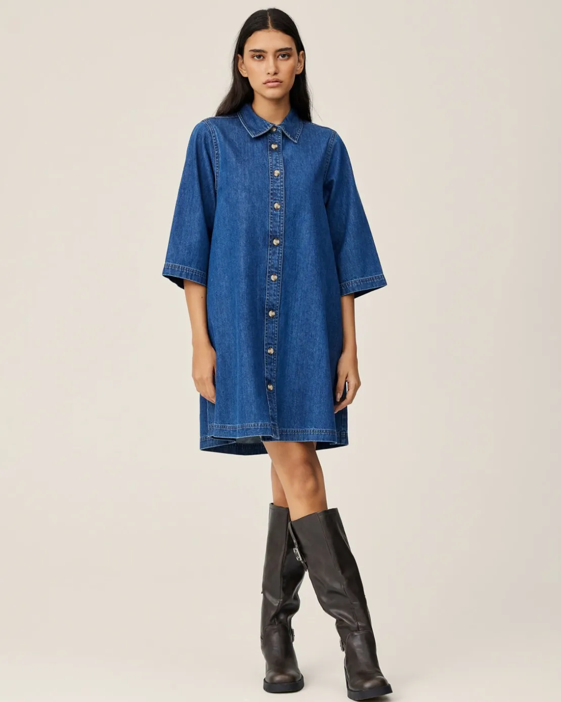 This A-shaped denim dress has a loose fit and all the detail inspired from a shirt. The classic collar, the full placket. The dress also features short wide sleeves. It’s a modern, cool twist to a never ending denim trend.