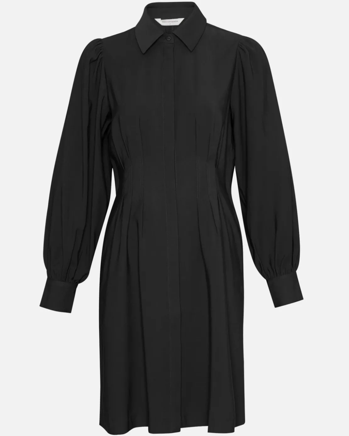 This dress has a shirt like look, but with vertical lining around the waist to enhance your figure and give the dress a slight tailored fit. It features long sleeves with a small puff, a shirt like collar and full length button closure.