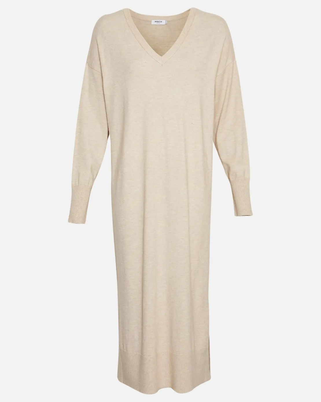 This long knitted dress has a V-neck, dropped shoulders and slit detailing.