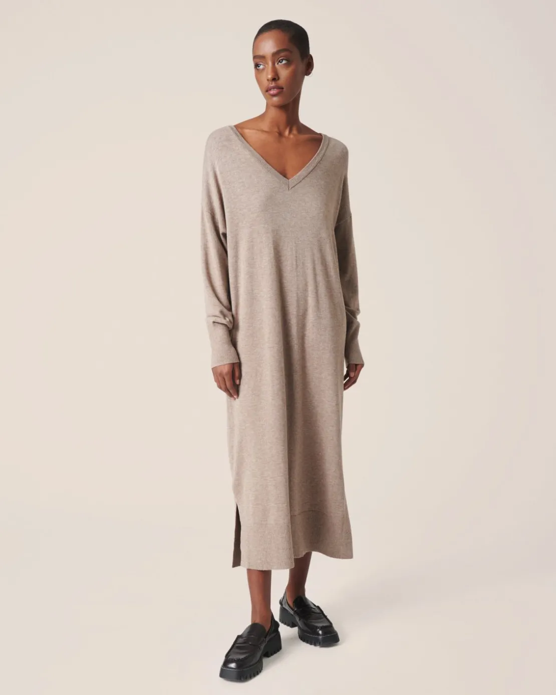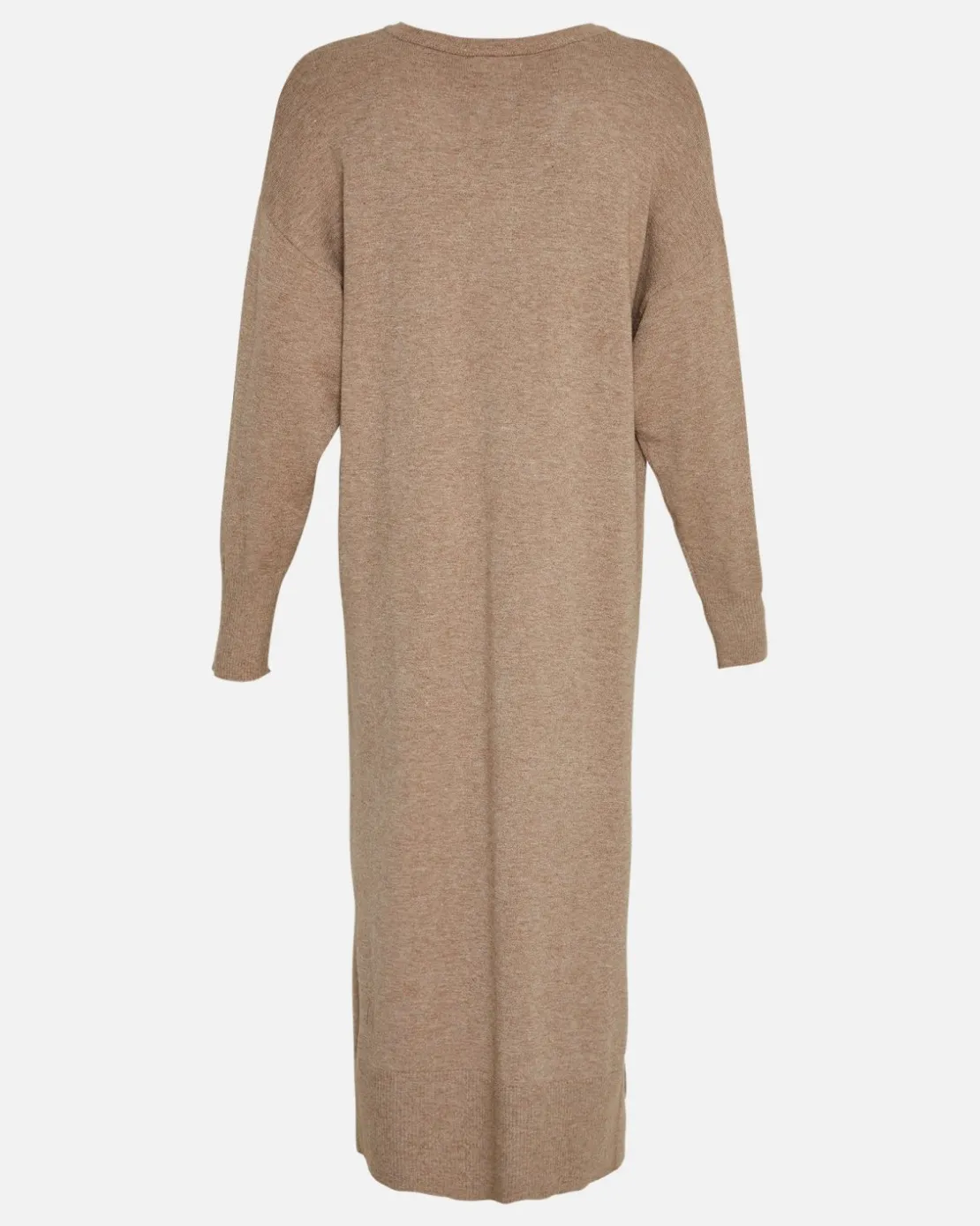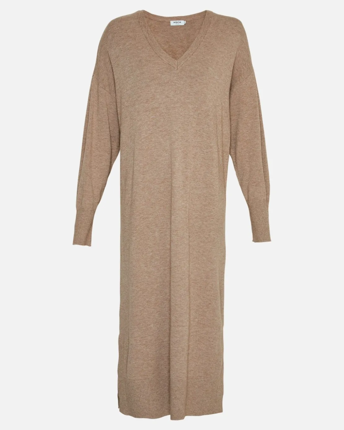 This long knitted dress has a V-neck, dropped shoulders and slit detailing.