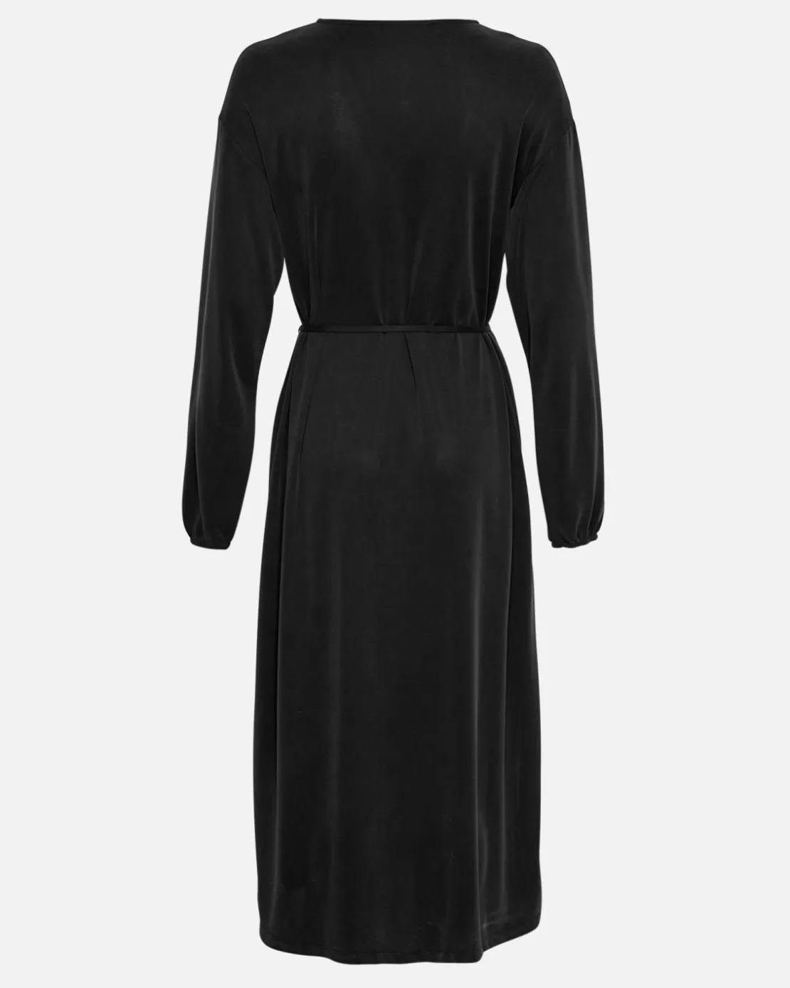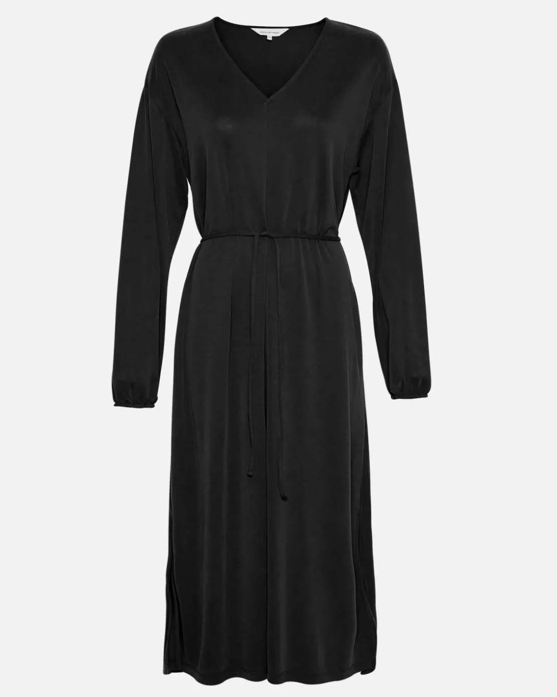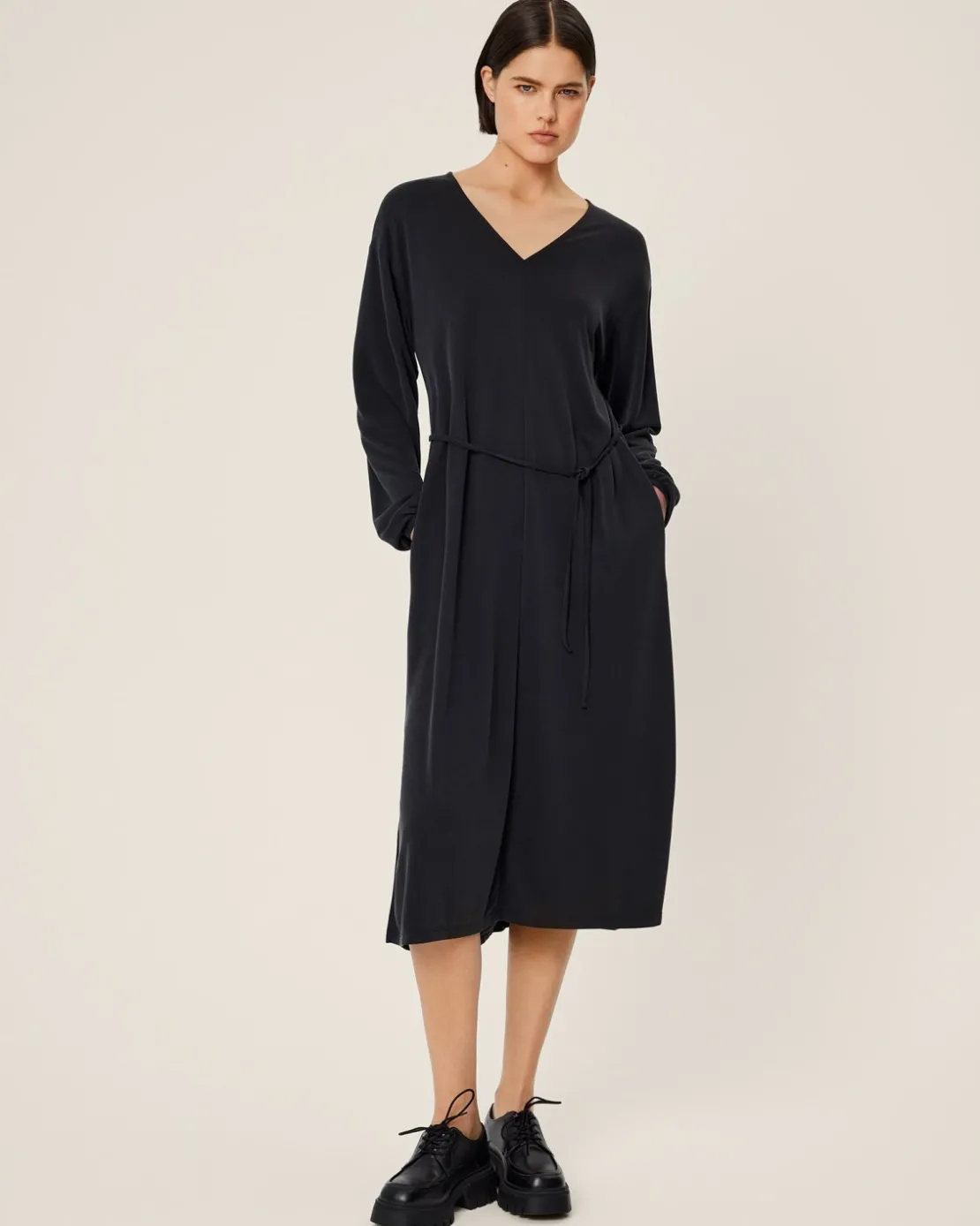 This is dress has an effortless vibe, as it features a loose cut with a belt around the waist and a soft V-neck. This is a staple dress to have in your wardrobe, as it can be styled for a fancy occasion, or be toned down for the office.