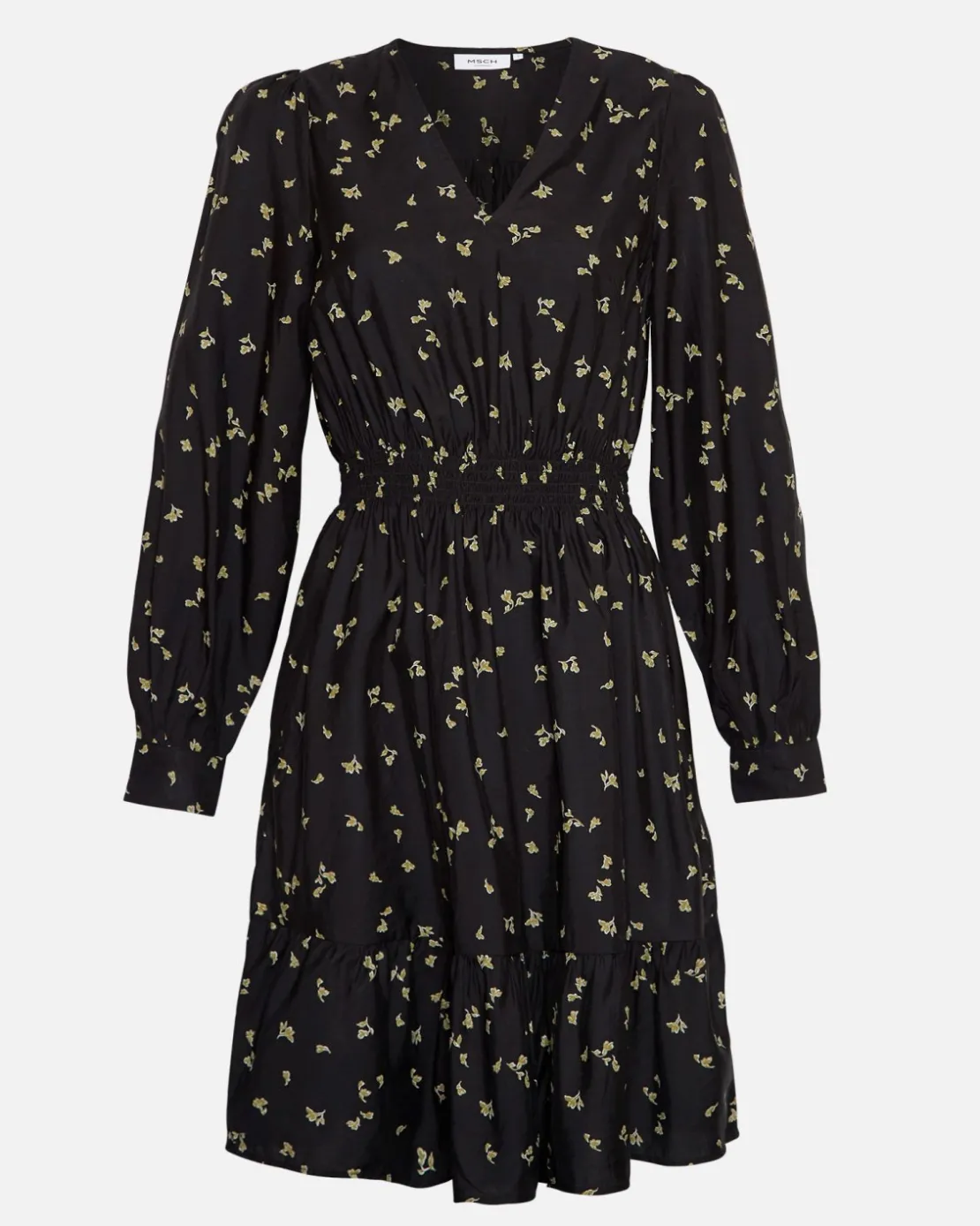 This dress is a celebration of contemporary fashion, combining a classic silhouette with a striking floral print. The black and yellow floral pattern blooms across the fabric, adding a burst of color and energy to the dress. The contrasting hues create a dynamic and visually appealing look that is both modern and timeless.