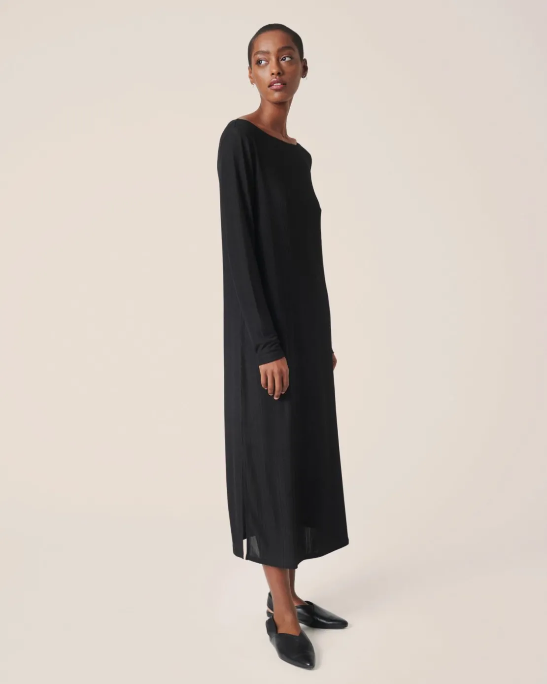 Master an effortless look with this simple yet elegant black dress. Round neckline, side slits and a beautiful fabric make a flattering silhouette. Add an oversized jacket or a tailored blazer and consider your evening outfit ready.