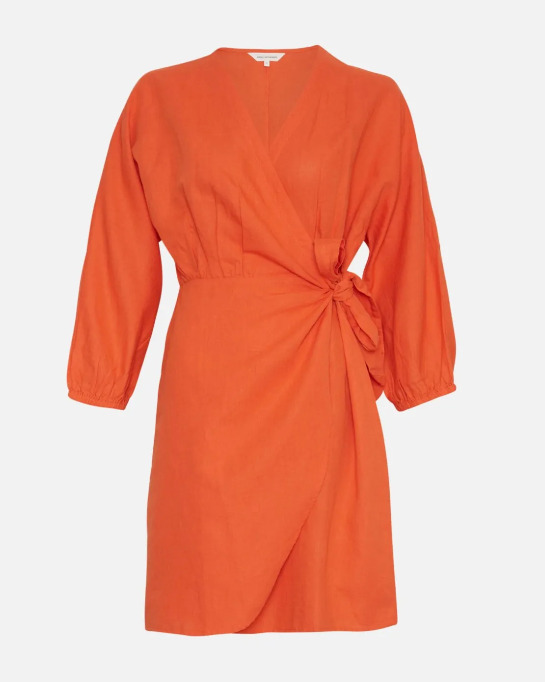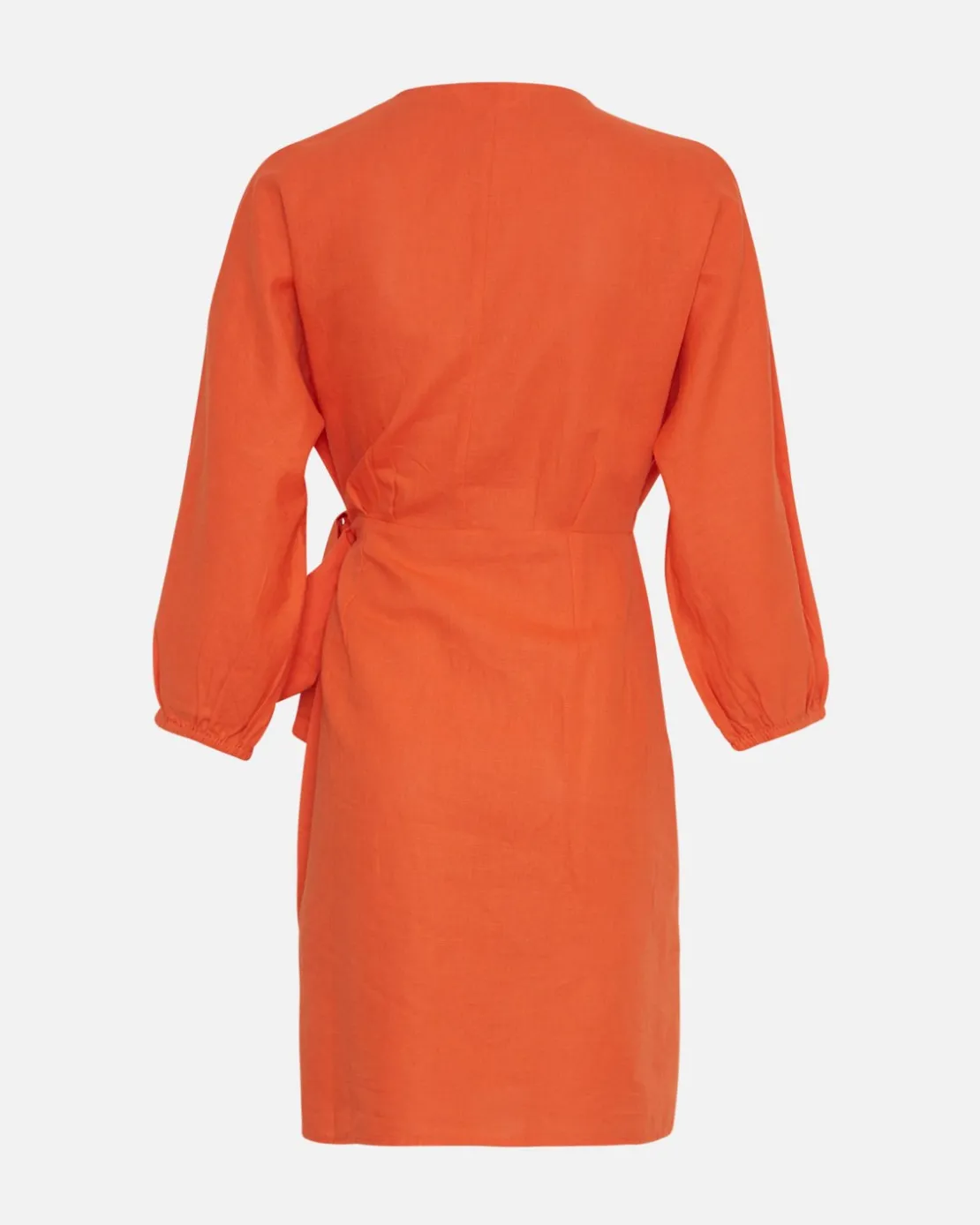 Mirilla is our linen-cotton blend material, perfect for warm summer days. This dress has a wrap feature, so you can adjust how tight you wish it to be. The dress has a V-neck and 3/4 sleeves. Style it with our basic colection underneath, as linen in light colours can be slightly seethrough.