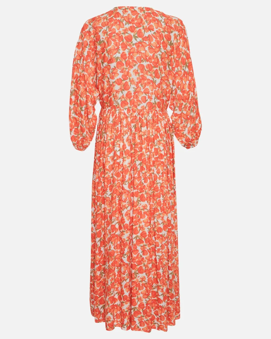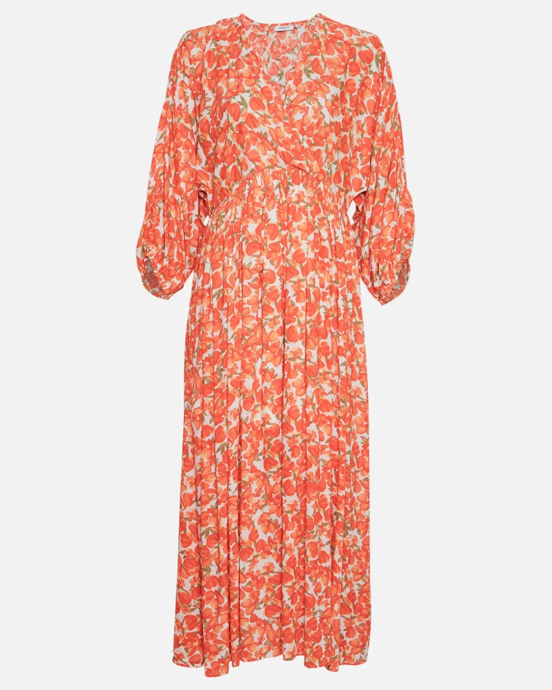 Pietra is long, flowy summer dress, with aa golden orange flower print. The dress has oversized 3/4 sleeves, a V-neckline and cutline detail at the waist, so give you a feminine silhouette despite the long loose fit of the dress. Style it with your favorite sandals or a pair of sneakers for a more casual vibe.