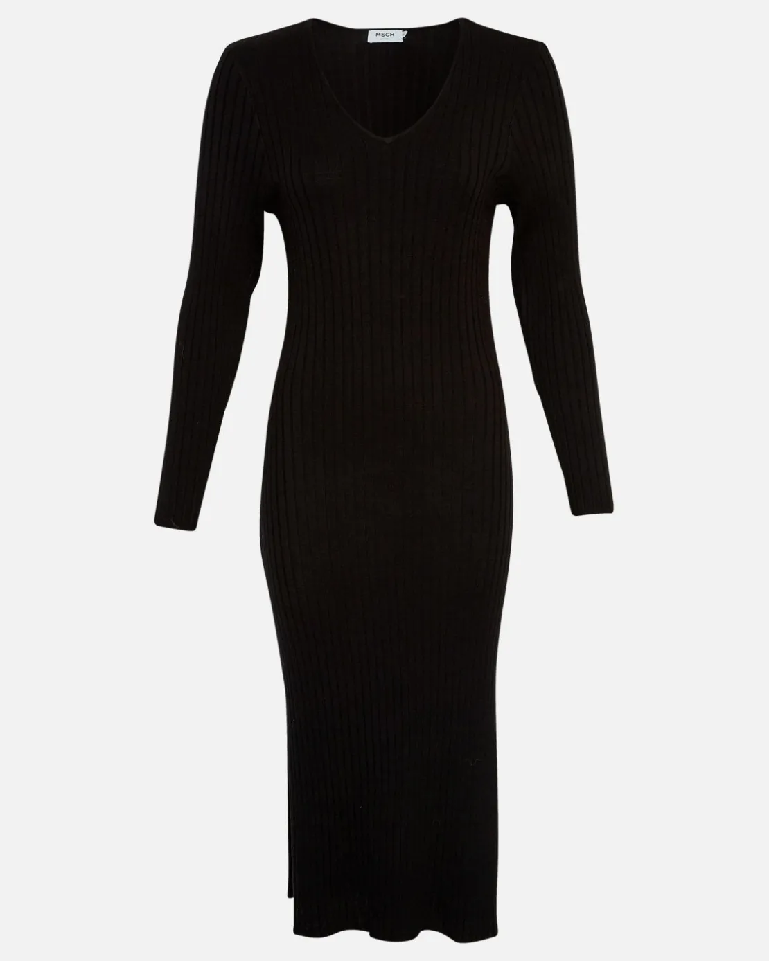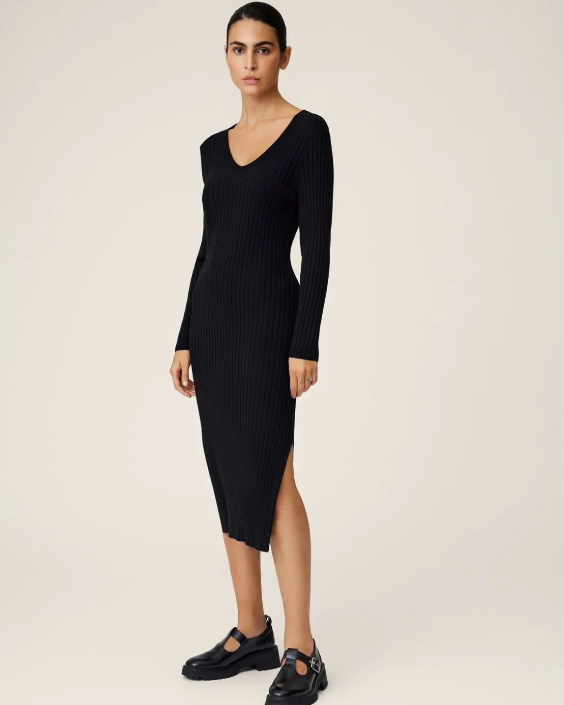 This dress has a slim fit. The model is 177cm and wears a size S/M.