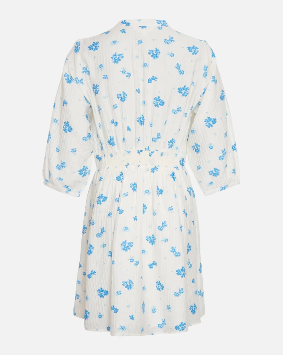 Our Rojan Vlore dress is a short flowy dress, created in a textured material printed with small simple flowers. The dress features a mandarin collar with V-cut, loose sleeves, buttons and elastic at the waist to highlight your figure.