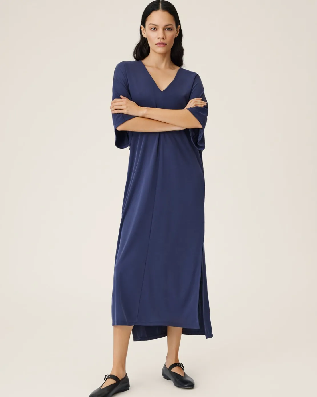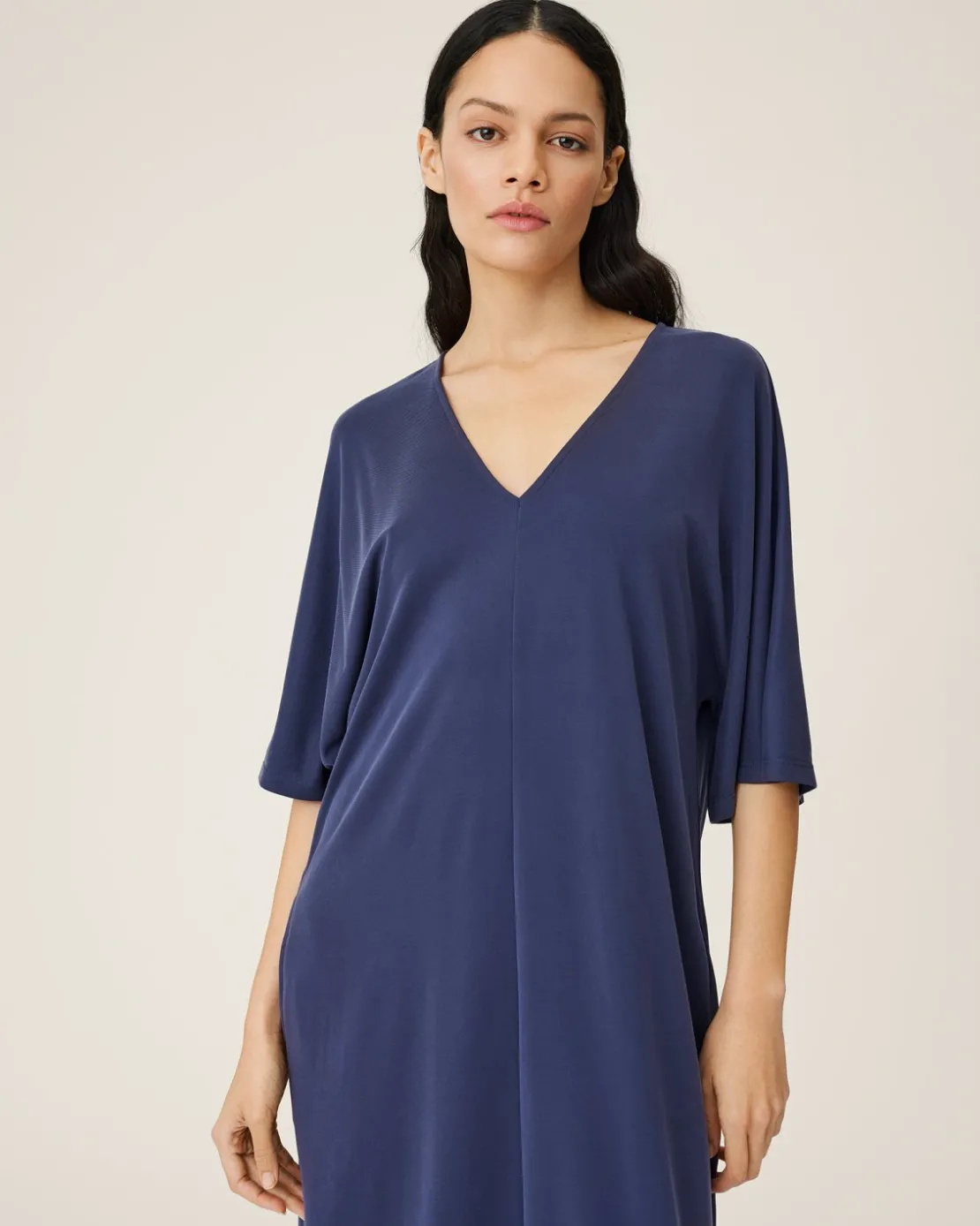 Our Sisca dress is the perfect combination between casual and stylish. The dress flows effortlessly with its long, loose-fit design, deep V-neck, longer T-shirt sleeves. It can be styled both as a summer dress but is also ideal for layering over jeans and with vests or knits on top. The dress comes off as very chill, but with the right styling, can be worn at so may occasions.