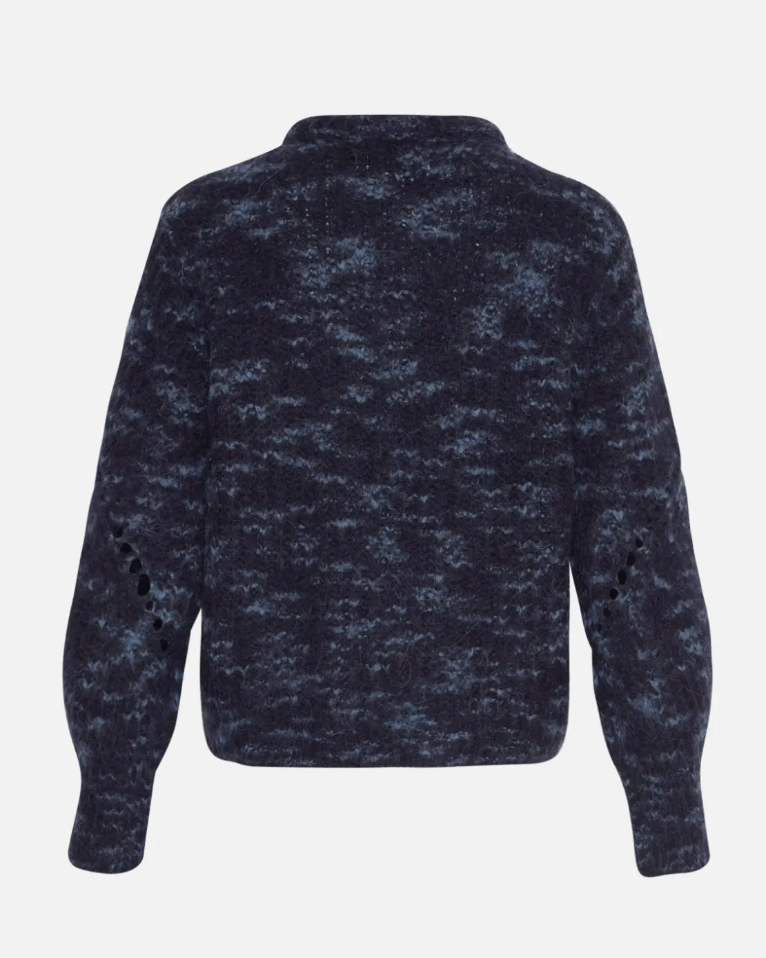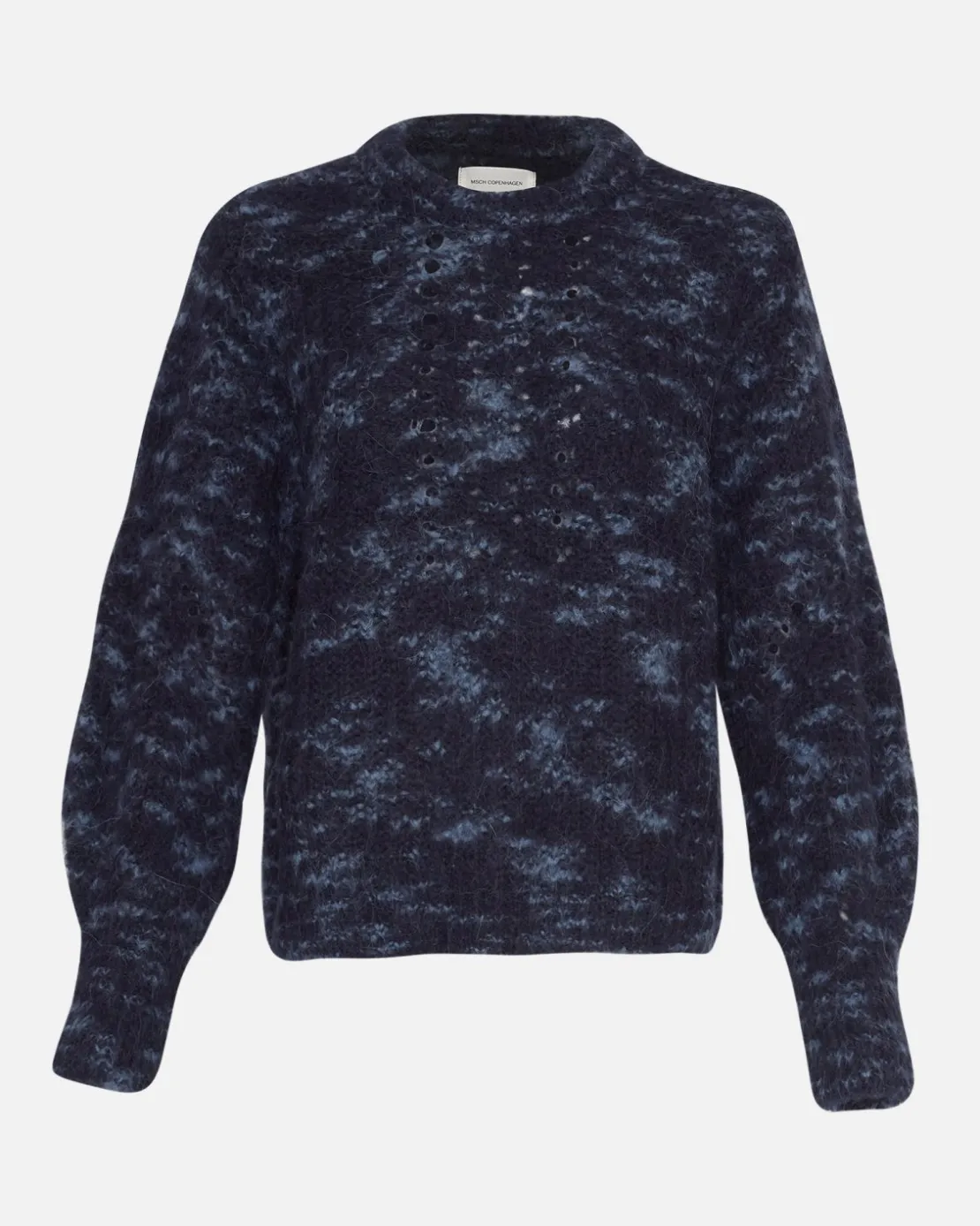 A chunky knit, made from a beautiful space coloured thread, creating a unique colouring. The knit features a round neckline and a longer, and slim cuff. It has slightly dropped shoulders to create a slouchy effect.