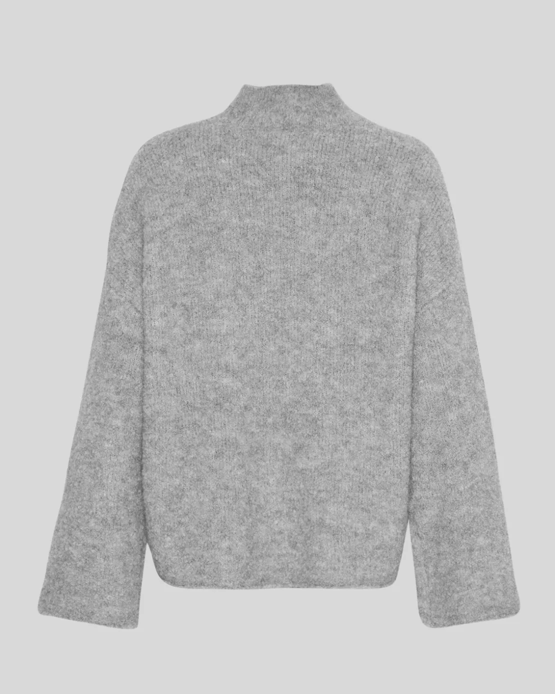 The Bathilda Erica Pullover in light grey melange is a luxurious knit crafted from a blend of alpaca wool, offering both warmth and softness. This high-neck sweater features a relaxed, slightly oversized fit with dropped shoulders, creating a cozy and effortless silhouette. The plush texture of the alpaca wool ensures comfort and breathability, making it perfect for layering in cooler weather. Whether paired with jeans or a skirt, this versatile pullover is a timeless addition to your wardrobe, blending elegance with the natural qualities of alpaca wool.