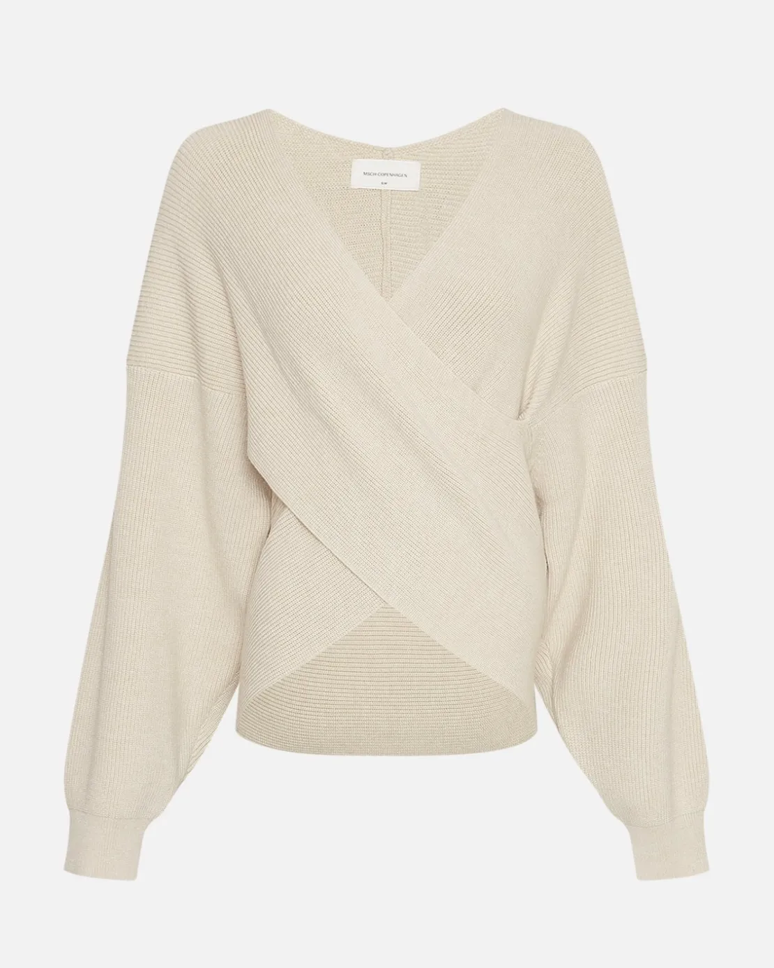 Wrap yourself in style with this chic pullover that offers a blend of timeless sophistication and modern flair. The half cardigan pattern adds a touch of intrigue to the classic knit design, creating an exquisite visual that sets you apart from the crowd. The wrap silhouette drapes gracefully, highlighting your figure and offering a flattering fit for all body types. It features dropped shoulders with a soft, cozy feel. This pullover is a highly versatile stye, seamlessly transitioning from day to night. Whether attending a cozy daytime gathering or a chic evening outing, this pullover exudes confidence and charm. Pair it with black washed jeans for a minimalistic look.