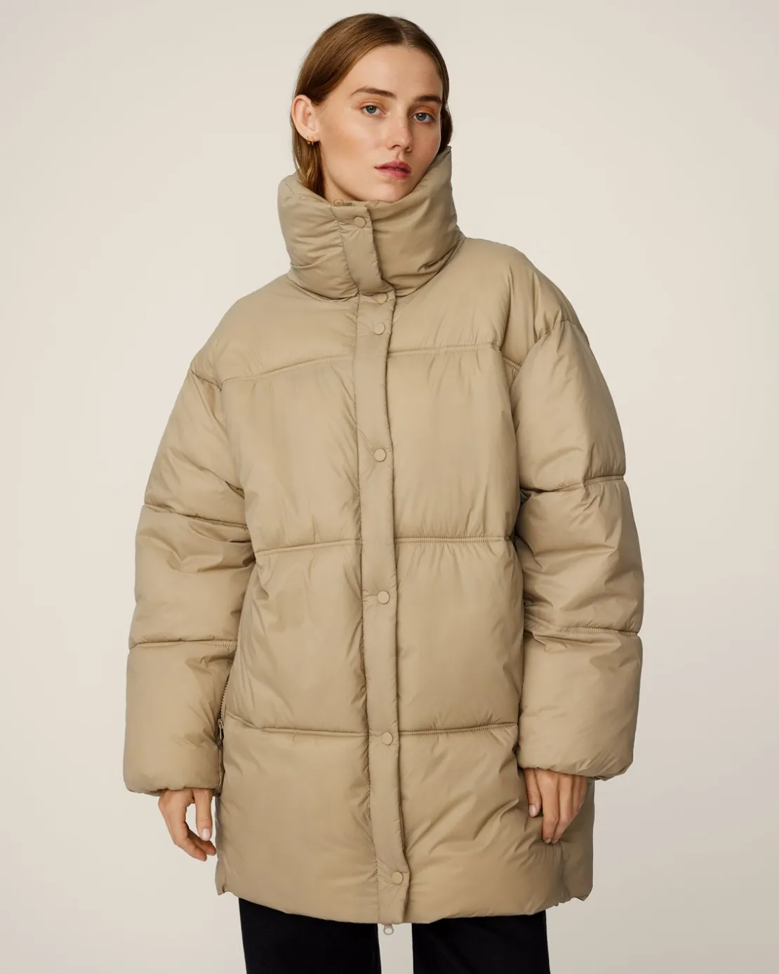 This statement piece is designed to give you a cool and chic style with its light down look. This puffer features a zipper closure with fabric covered buttons to give it a touch of retro charm. The oversized fit offers a modern touch, making it the perfect choice for those seeking a bold fashion statement. The high neck dettail offers extra insulation against the cold, and the side pockets provide a functional feature to this jacket. Pair with your chic wide-leg jeans for a stylish outfit and layer under with your favorite winter pieces.