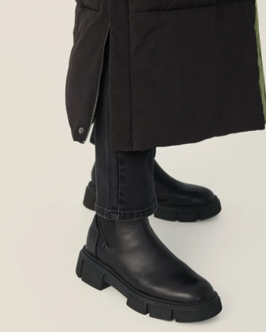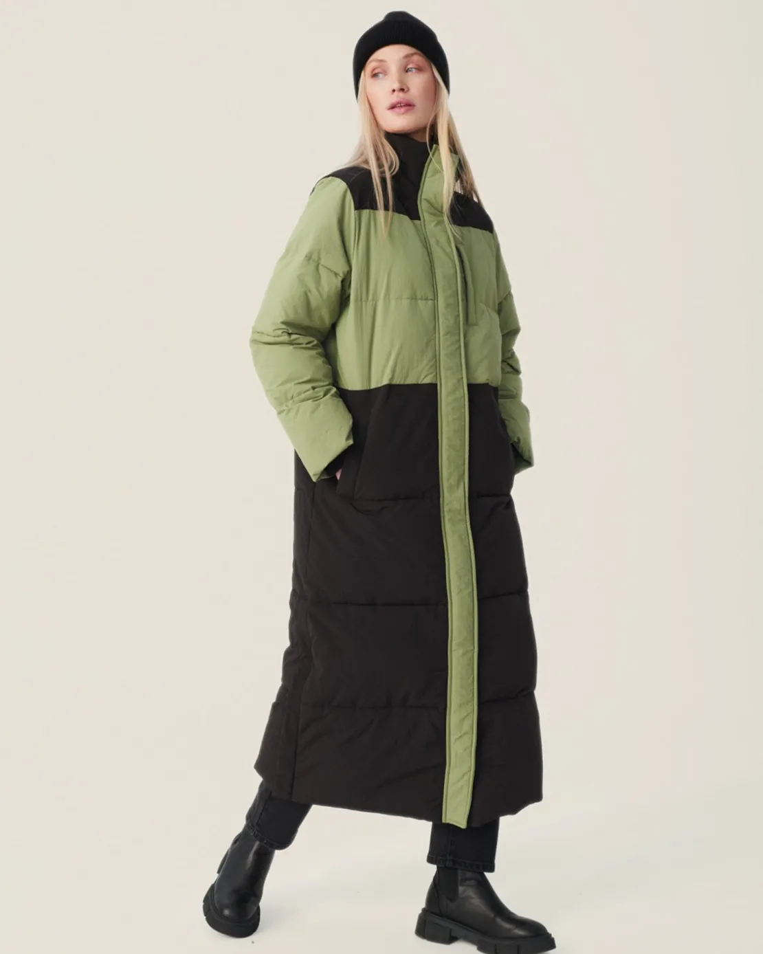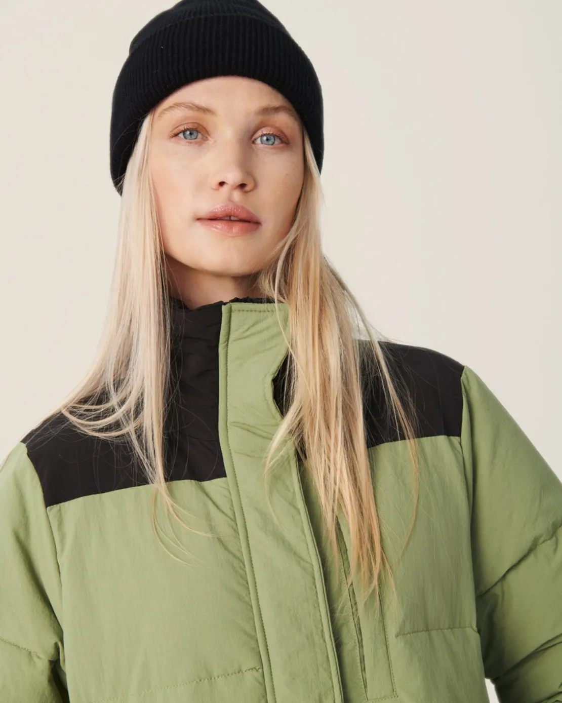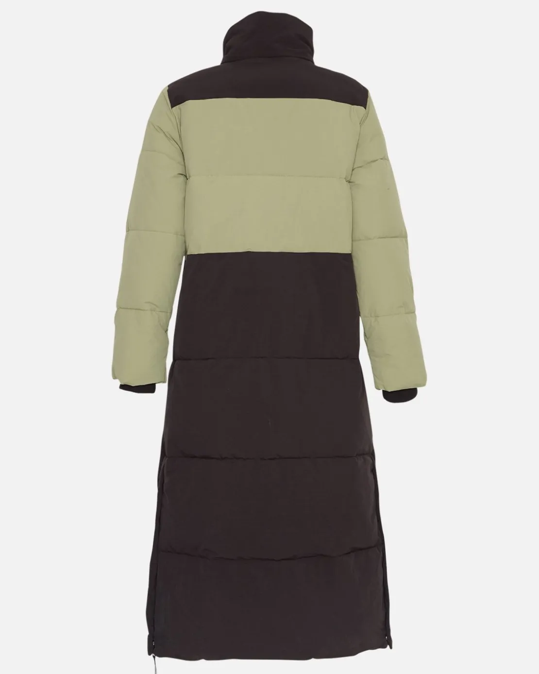 The Evanna features both buttons and a two-way zip up, it has two side pockets and a slide split with a zipper.The jacket is designed with a cool colourblock effect to give it a more cool vibe.