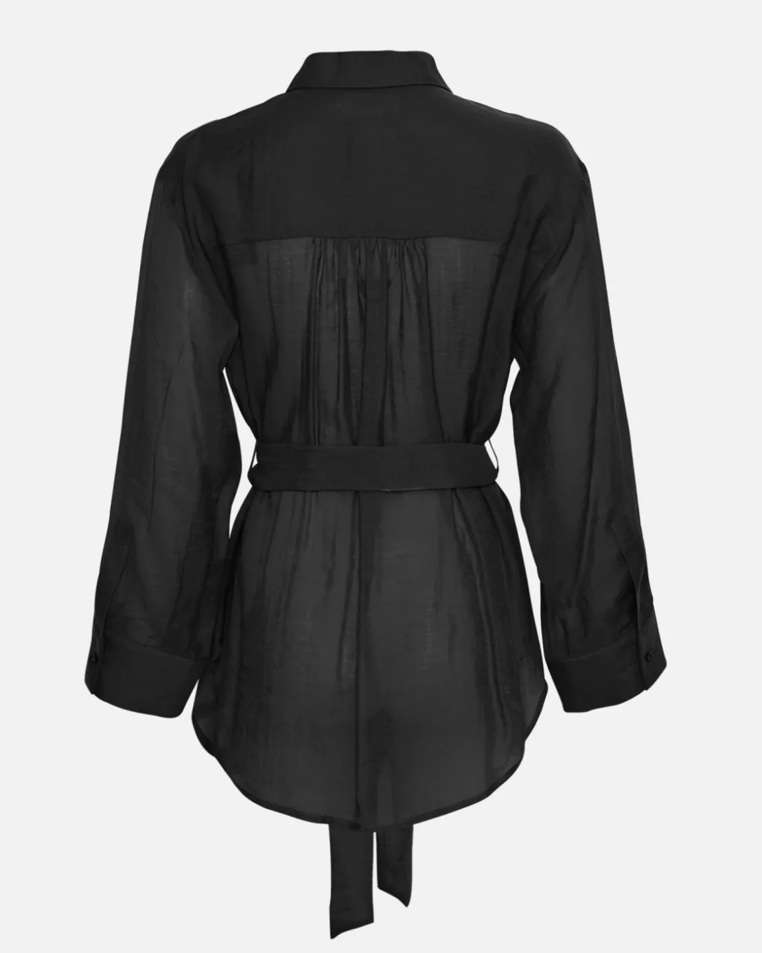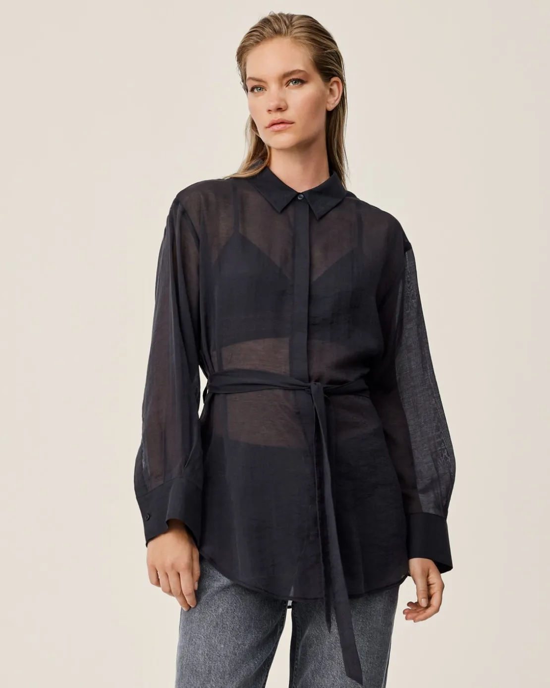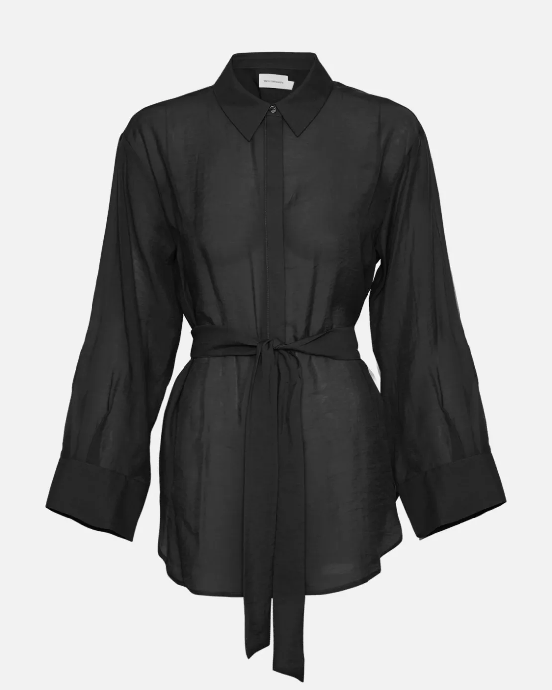 Carcella shirt is a soft mesh shirt, with a belt to tie around the waist. The shirtfeatures a classic collar and cuffs and a hidden placket. The hem is slightly curved. This is an ideal subtle yet festive shirt. It’s feminine and intruiging. Style it with a pair of dark pants or jeans to match the vibe.