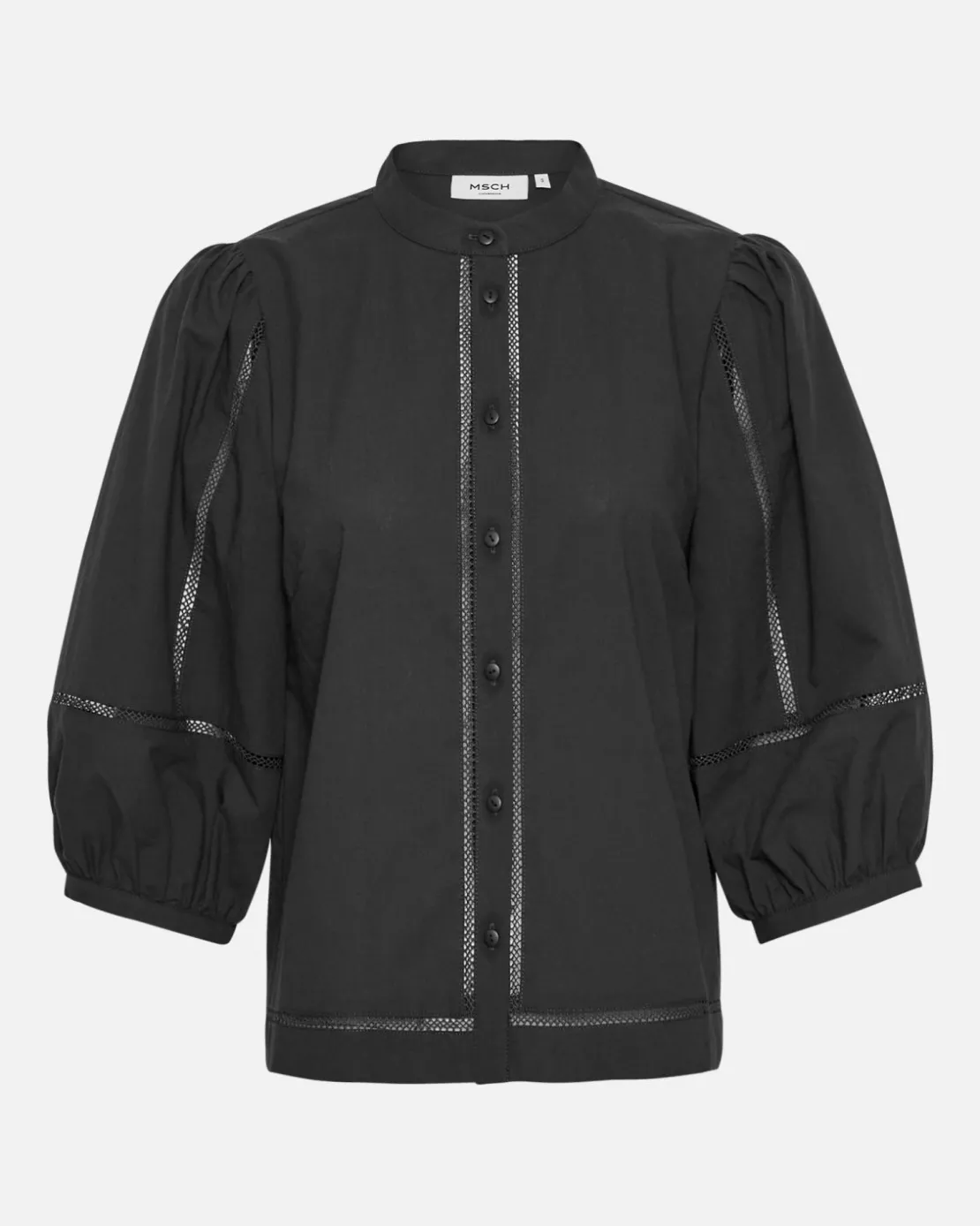 Our new Erendia top is a feminine top that features a round neckline with mandarin collar, button-up closure and short sleeves in 2/4 length. It comes with romantic tape details across the sleeves, the hem and on the front. It’s ideal for both a casual outing, an office outfit or styles with jeans.