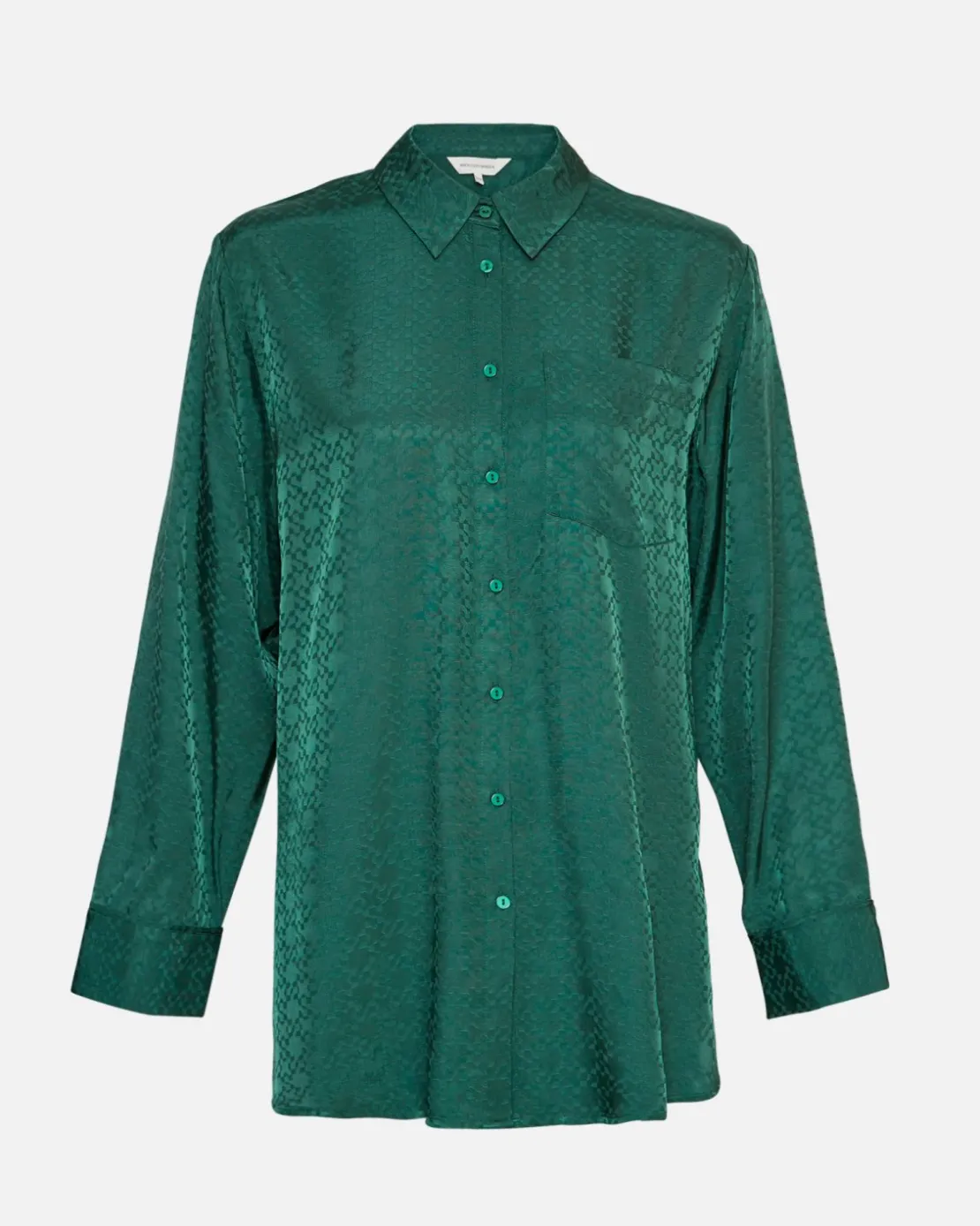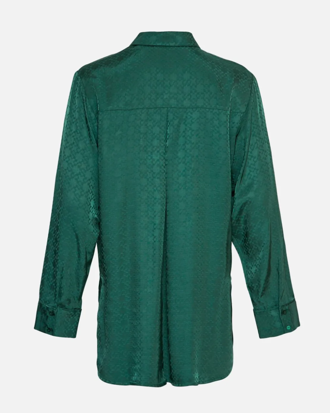 Gennelie is a soft and shiny loose, long shirt, and is bringing back the highly loved pyjamas trend, but make it everyay attire. The Gennelie series consists of a shirt and matching pants, both in a deep green colour with a jacquard pattern that provides a luxurious look. The shirt is classic with its button closing, collar and cuffs. If a full green set is a bit much, style it with a pair of black or light-colored suit pants.