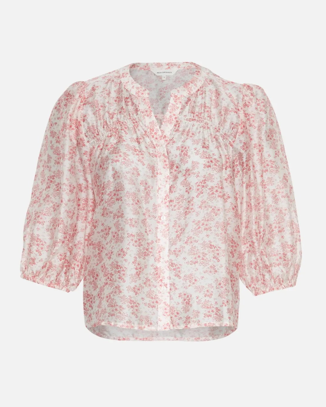 Isadora is a light pink, flowered print that screams summer. This shirt features a 3/4 sleeve with elastic cuffs, a subtle V-neck with buttons all the way through and elastic detailing on the chest. It’s incredibly feminine and can easily be you go-to shirt for warmer days. Style it with light pants to match the soft white nuances of the pattern, or with black or blue to give it some contrast.