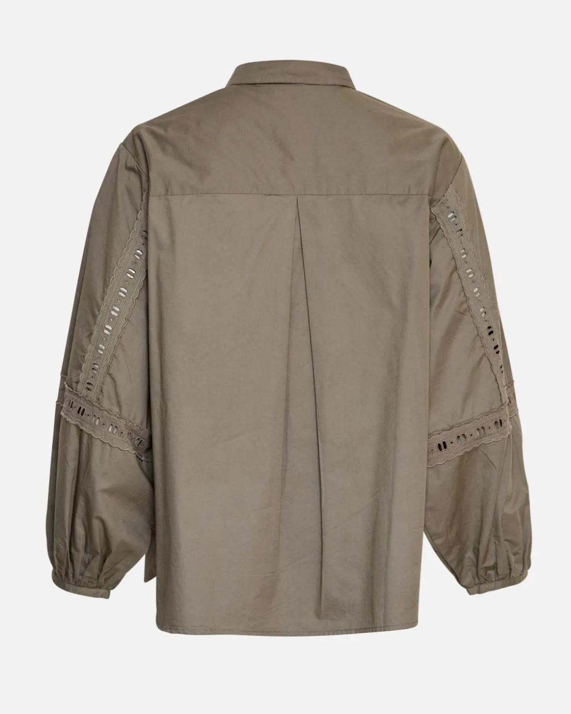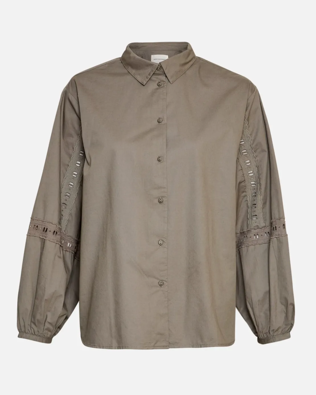 This shirt features balloon sleeves with a slim cuff and emb tape on the sleeves, giving the loose shirt a feminine touch. The shirt has a classic collar and a full placket. Style it with jeans for a modern look.