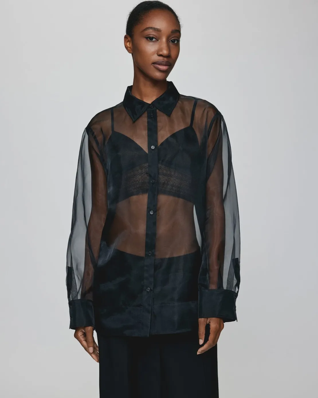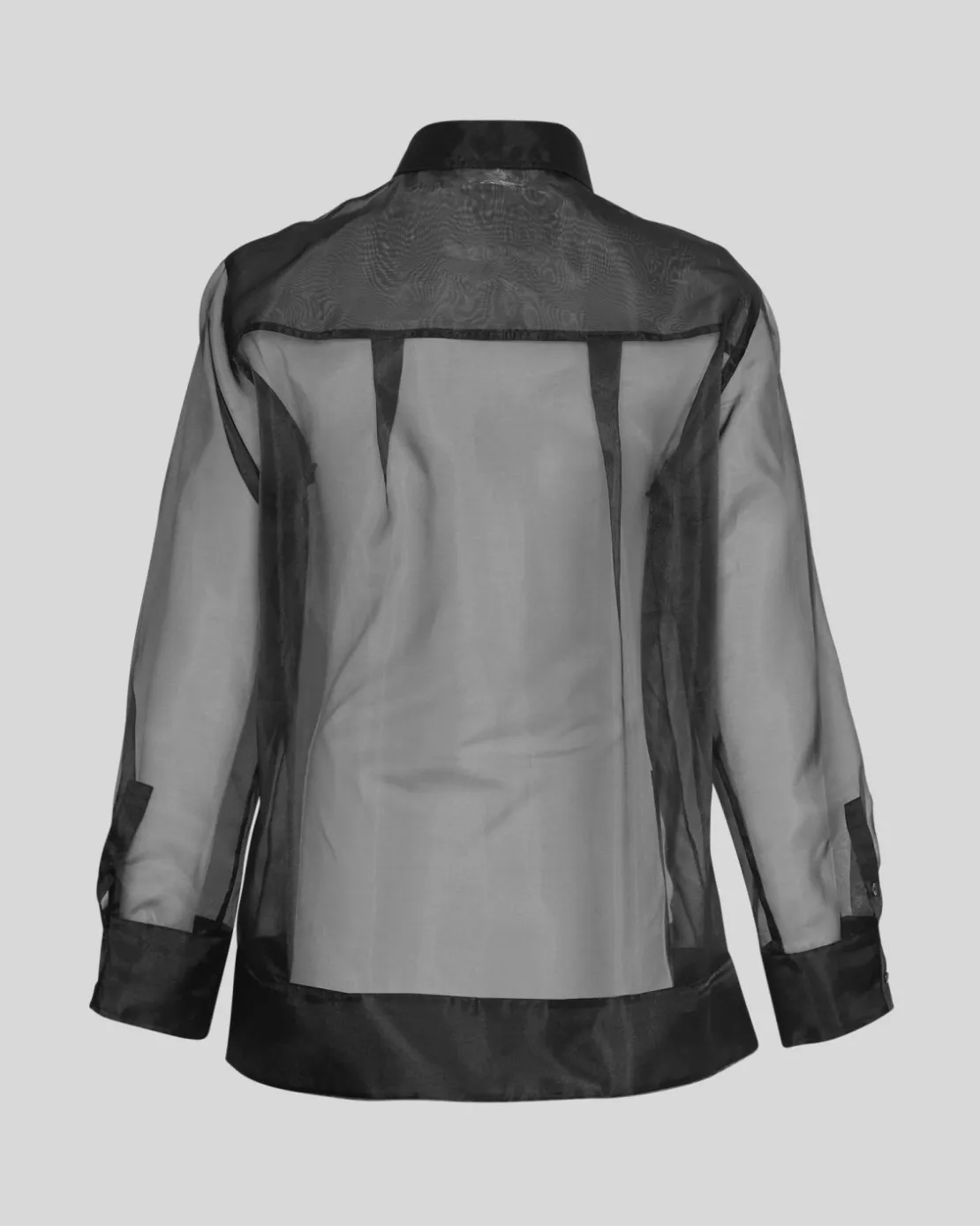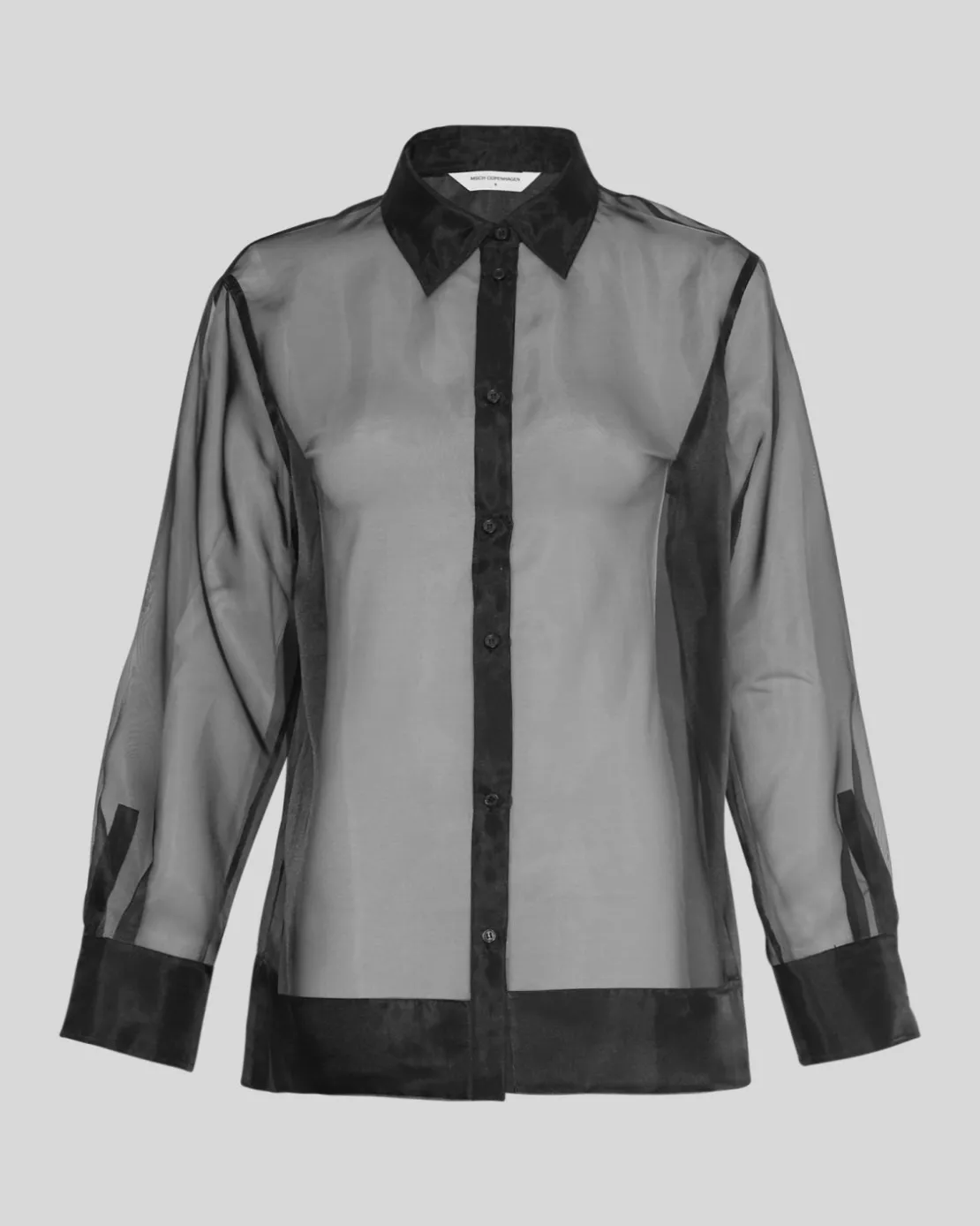 The Lita shirt is a combination of the classic, oversized shirt and a festive and feminine shirt. The shirt features a black collar, placket and cuffs while the rest of the shirt is in a sheer recycled polyester material.