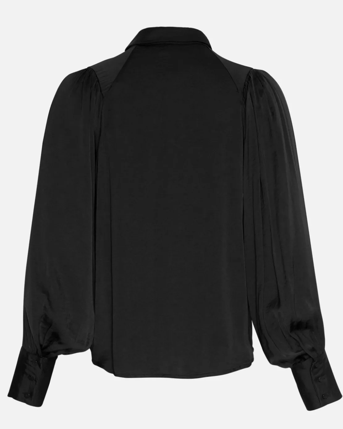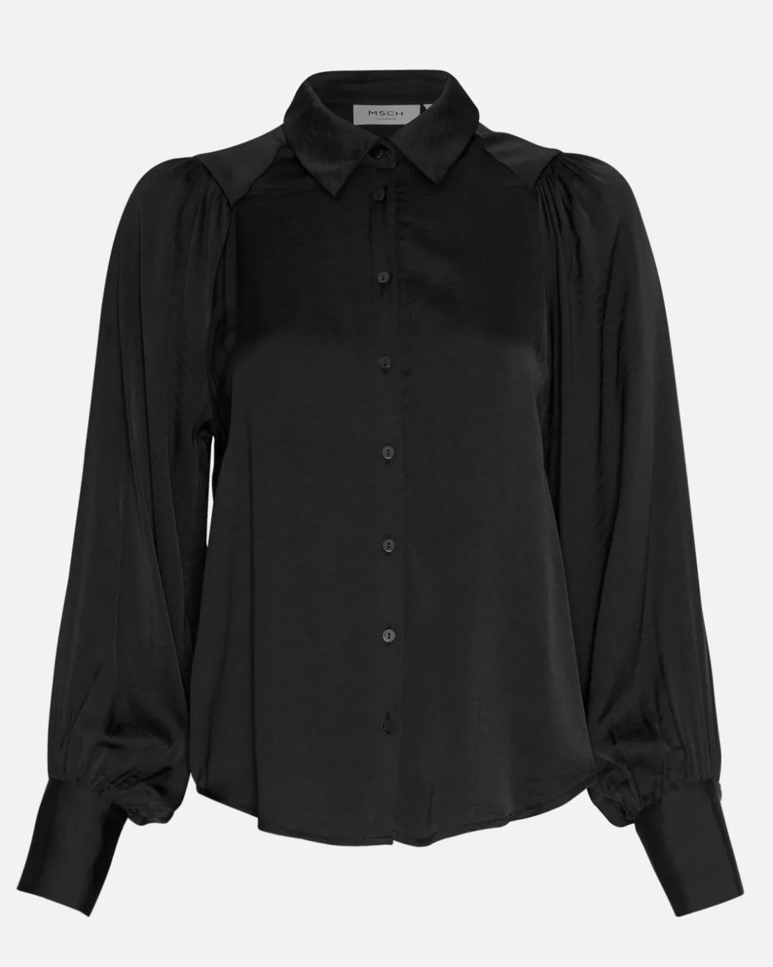 The Maluca shirt is a combination of classic and trendy with a touch of the pyjamas trend. It’s lightweight and flowy, with ballon sleeves, a classic collar and cuffs. The deep black colour and the shiny look to the material makes it perfect for dressing up jeans, or used in a more formal occasion.