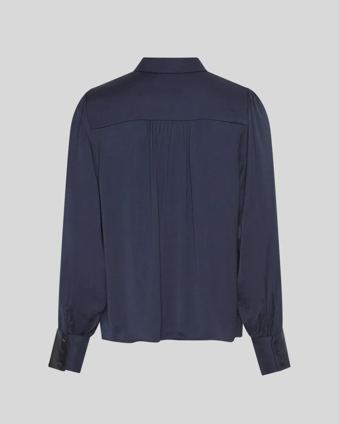The Maluca shirt is a combination of classic and trendy with a touch of the pyjamas trend. It’s lightweight and flowy, with ballon sleeves, a classic collar and cuffs. The deep blue colour and the shiny look to the material makes it perfect for dressing up jeans, or used in a more formal occasion.