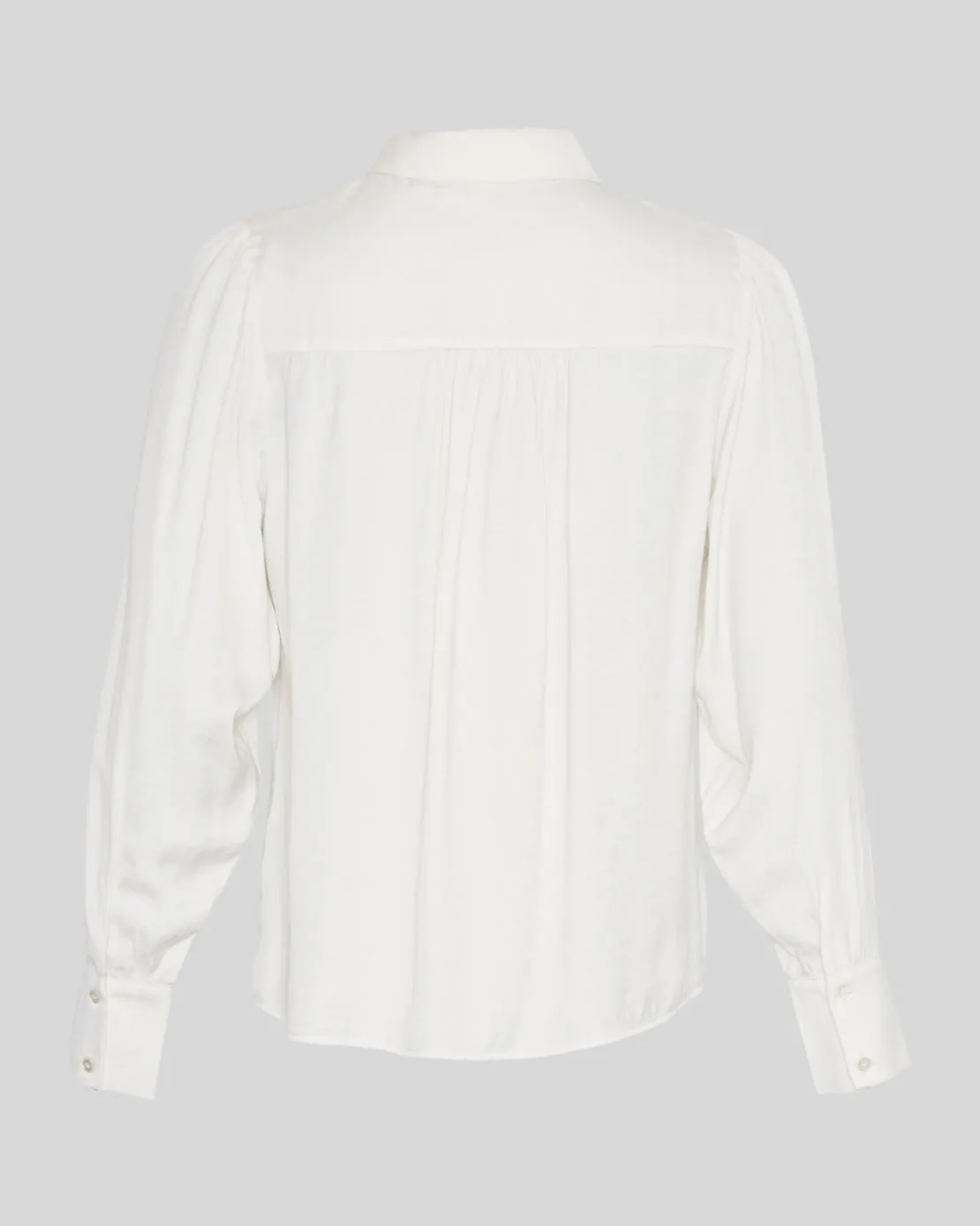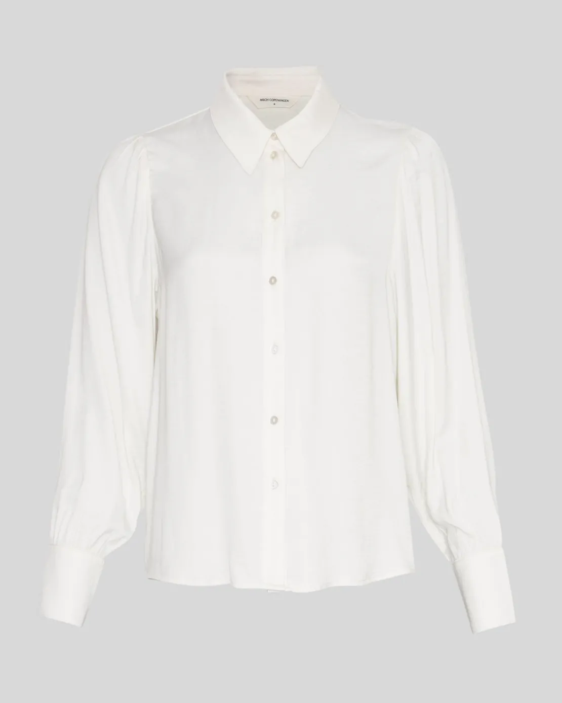 The Maluca shirt is a combination of classic and trendy with a touch of the pyjamas trend. It’s lightweight and flowy, with ballon sleeves, a classic collar and cuffs. The white colour and the shiny look to the material makes it perfect for dressing up jeans, or used in a more formal occasion.
