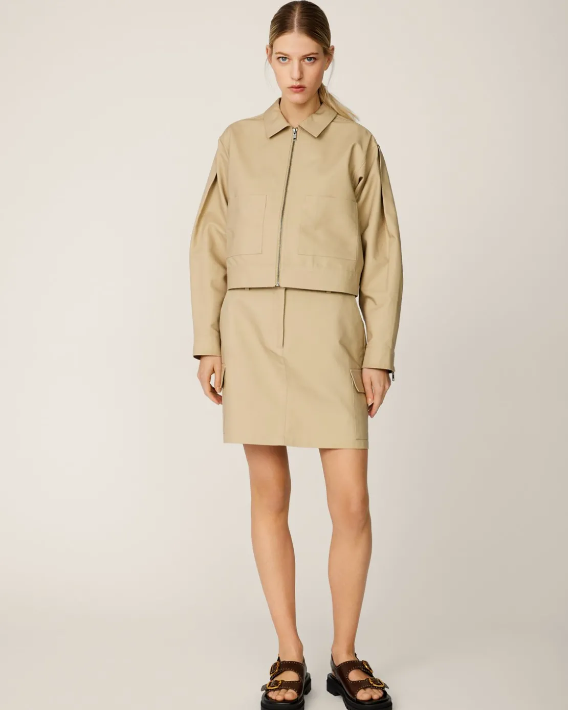 Short skirt with Scandinavian minimalism. It features side pockets, zipper fly, belt straps and two front pockets touched with feminine elegance. Style with a simple top and the matching Josefine jacket.