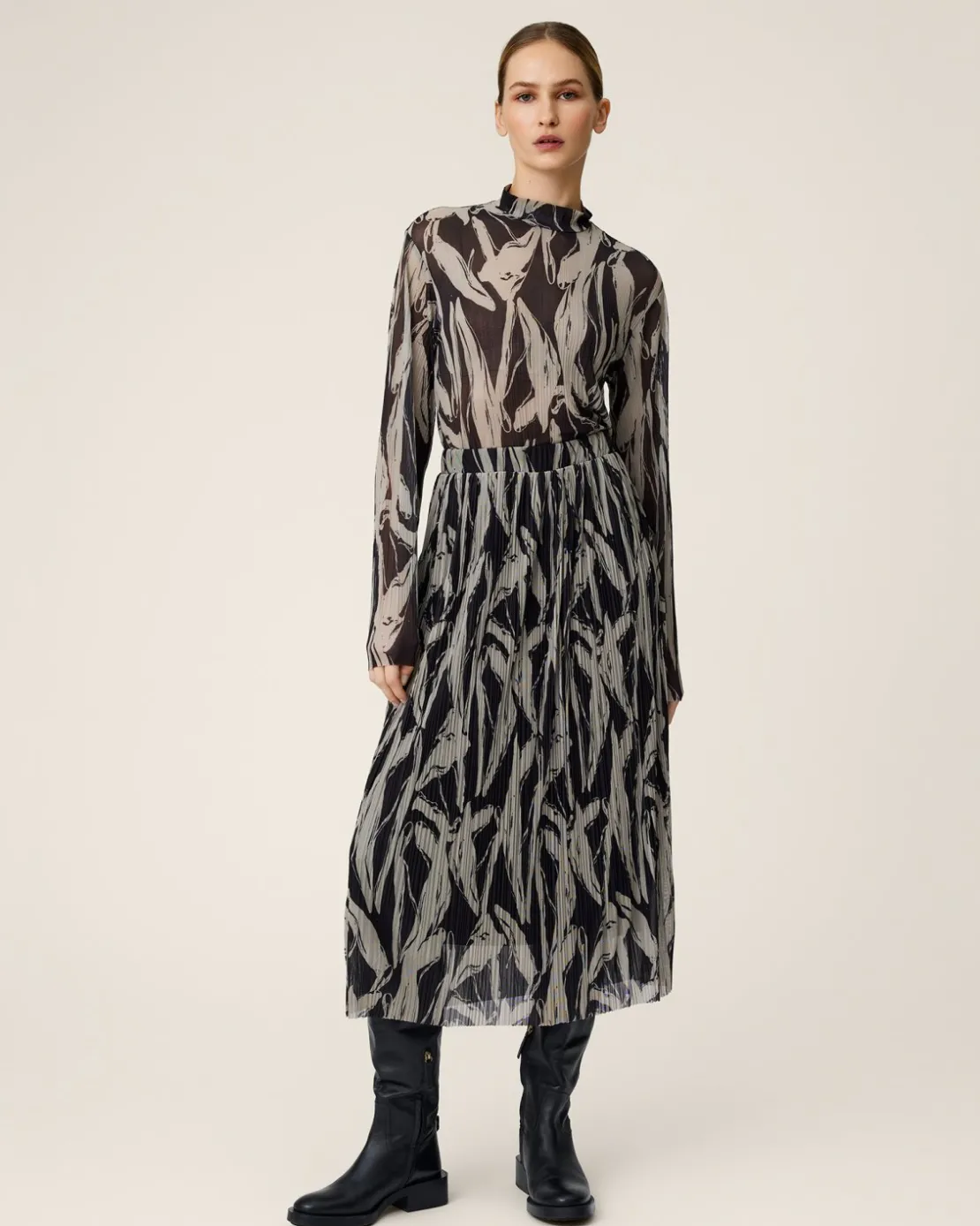 A feminine long skirt that effortlessly combines a relaxed, flowing silhouette with a unique print. Crafted in a sophisticated mesh quality, this material drapes gracefully on your body with plisse details. It features an elastic waistline for a customized fit, that blends both comfort and chic.This mesh skirt can easily be transformed from a daytime look to an evening silhouette: style with matching mesh top to a complete the printed look, or pair with a feminine top.
