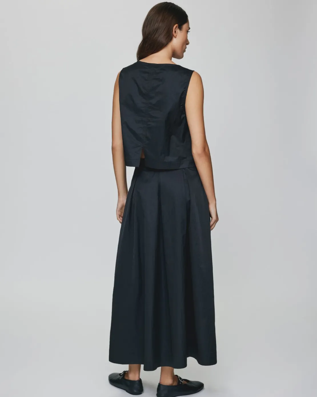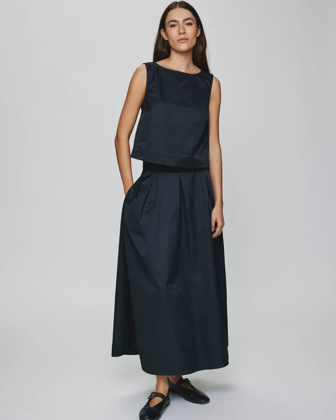 This skirt has a tailored fit. The model is 177cm and wears a size S.