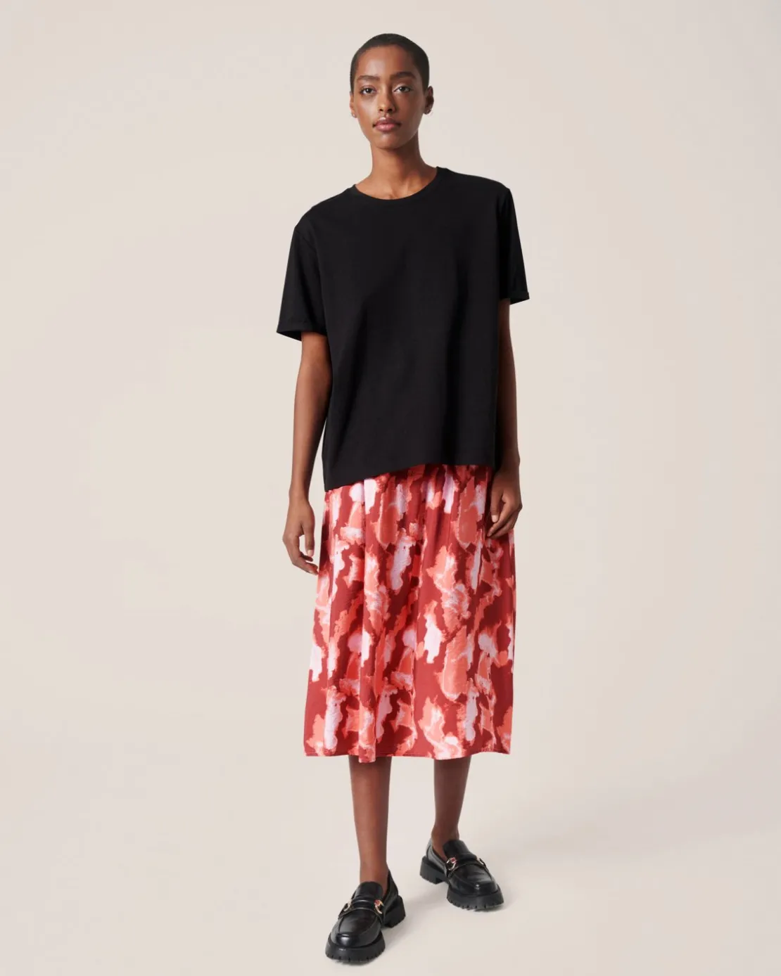 This skirt has a loose fit. The model is 176 cm tall and is wearing a size S.