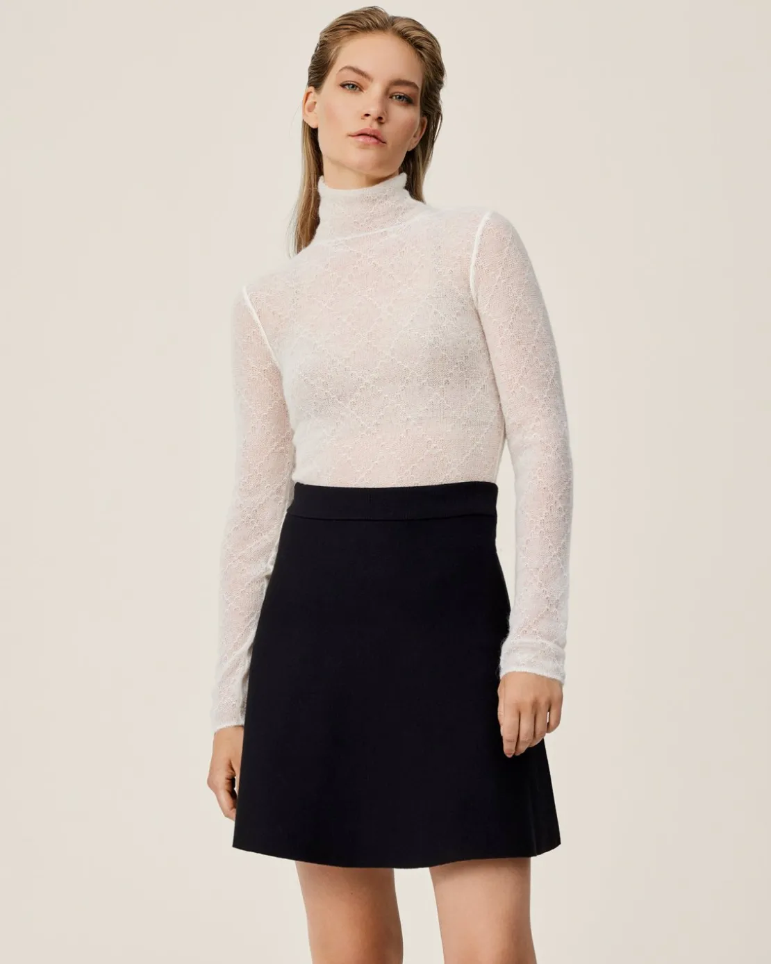 This short skirt is designed for ultimate comfort with its elastic waist, providing a secure fit and an easy way to hop in it. The A-shape adds a touch of volume and elegance, and flatters all body types, making it a versatile piece for various occasions. The full needle structure of the skirt does not only adds texture but also provides a sophisticated look. This timeless short skirt is a foundation piece to every feminine outfit, whether paired with a basic tee, or a classy rollneck.