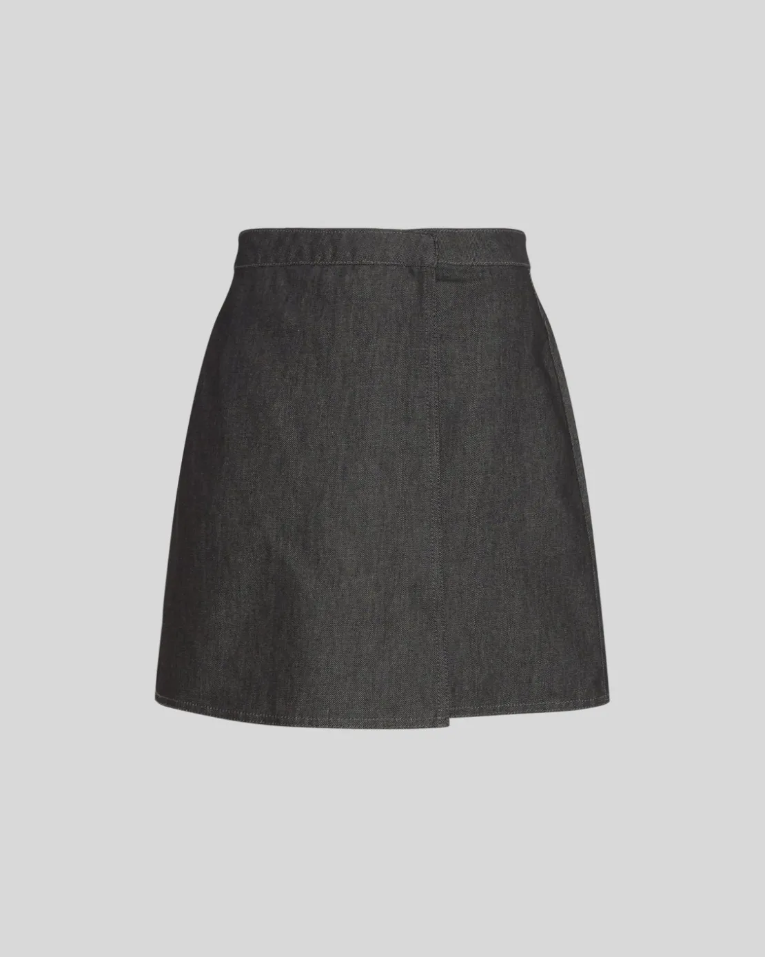 Elena is a soft denim quality, in a black washed colour. This skirt is a mini skirt, and features a wrap design, with a button closure. It’s edgy and cool. Style it with the matching denim jacket and a pair of high boots.