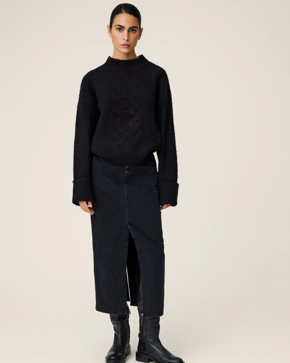 This skirt is a modern interpretation of classic denim, elongating the silhouette and adding a touch of edgy elegance.The length of the skirt is designed to fall gracefully below the knee, and with both a front and back slit to ensure there’s room for movement. Style it up for a fancy occasion og wear it as an everyday outfit with T-shirt, a knit and sneakers.