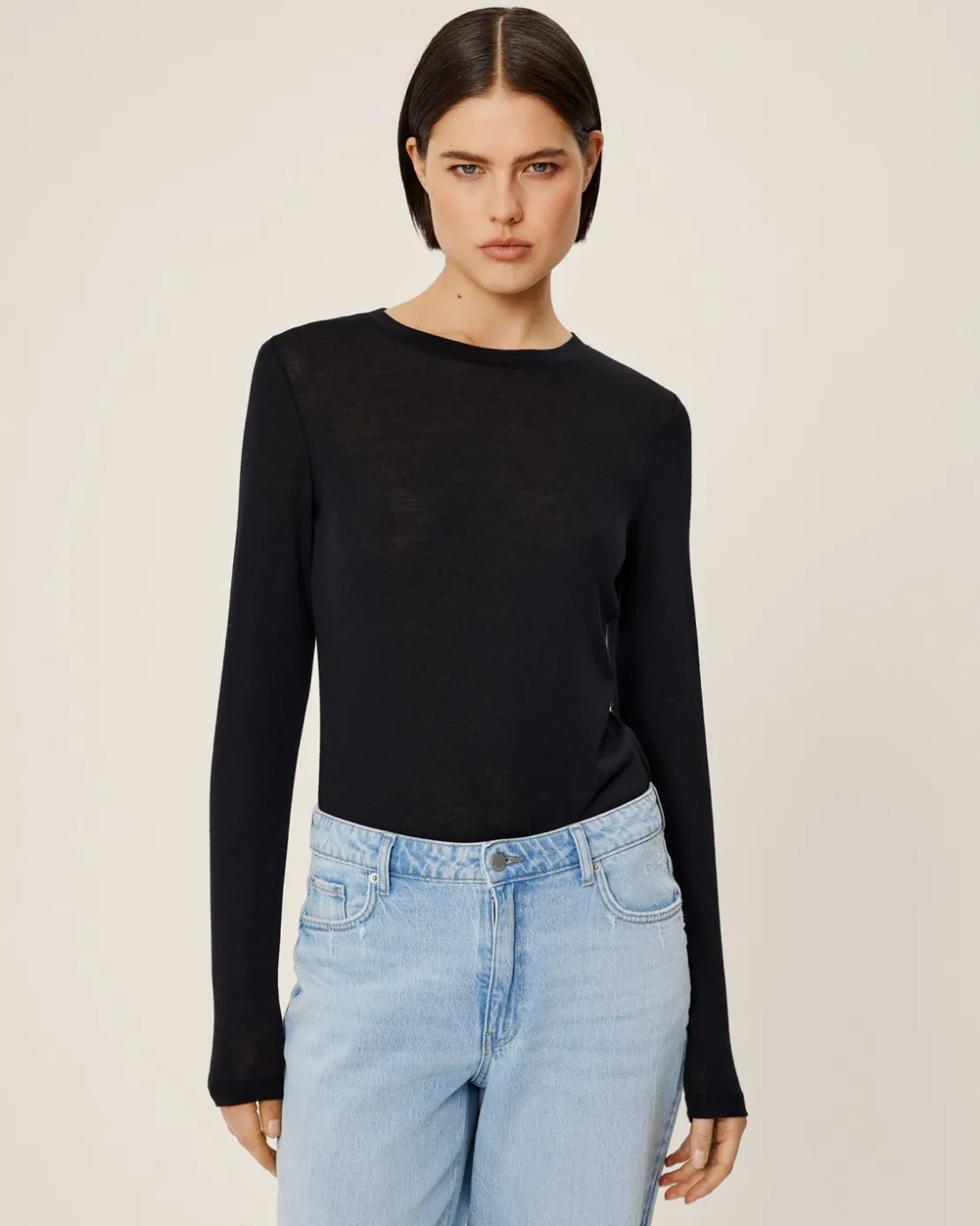 Chatera is a basic essential top, combining simplicity and effortless style. This long sleeve top is designed for a flattering slim fit with a body hugging feature. It features a timeless round neckline and long sleeves, making it the perfect wardrobe staple for colder days. It is crafted with high-quality materials, ensuring a soft feel, making it easy to wear as a layering piece. Whether dressing up your tailored suit with this simple yet chic basic top, or styling a pair of casual pants, this top is a foundational piece for any fashion-forward wardrobe.