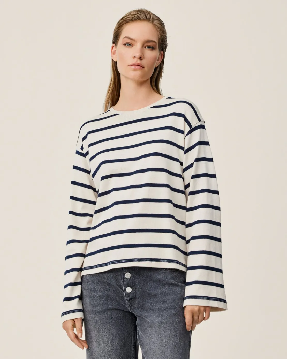Bahara is a light, long sleeve pullover with black horizontal stripes. It is a classic crewneck top, which can be an effortless edition to any outfit, and a strong foundation for a versatile wardrobe, as it can be styled in many ways. Combine with your go-to jeans, an easy-breezy summer skirt or elegant pants, it can make an effortlessly chic outfit in no seconds.